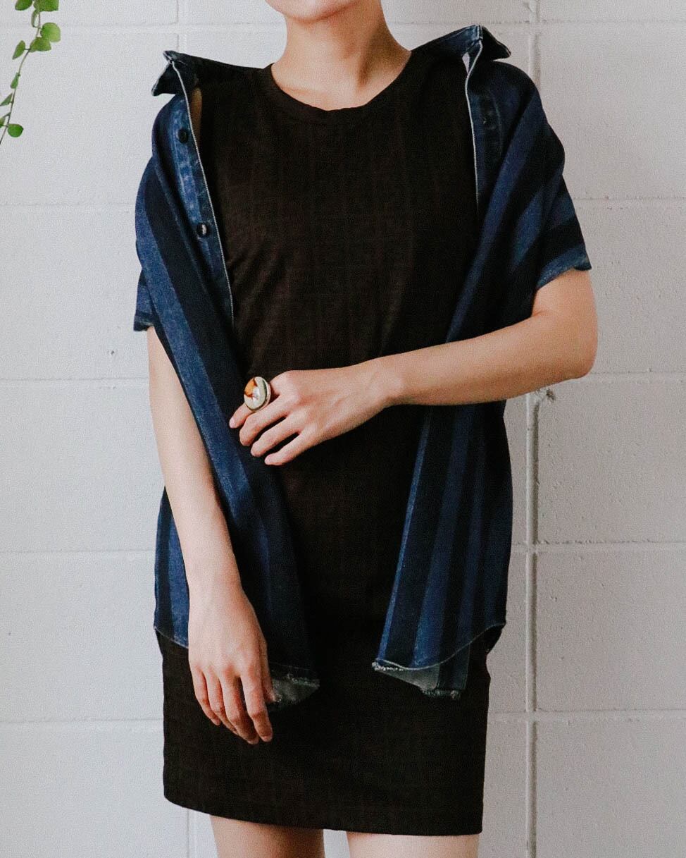 肩パットとはまた違う、デニム生地だからこそのショルダーラインがカジュアルモードな印象に。ベストのようにも、トップスとしても着かたを楽しみたい一着。