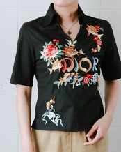 クリスチャンディオールのオープンカラー トップスはフランス製。フロントとバックスタイル、全体的に刺繍になったカラフルなデザインがとってもキュートで、ショート丈のミニマルなトップスはボトムズインもアウトもしやすい。しっかり目のコットン100%生地は着心地もよく、つい手に取りたくなるスペシャルな一着です。