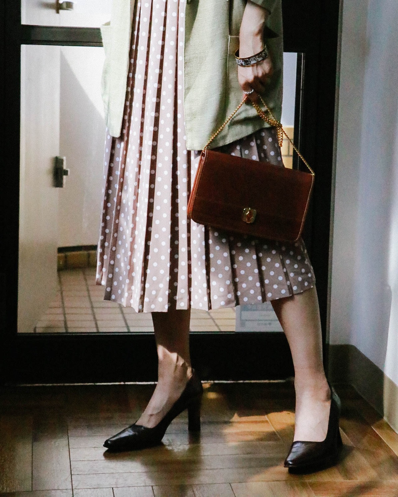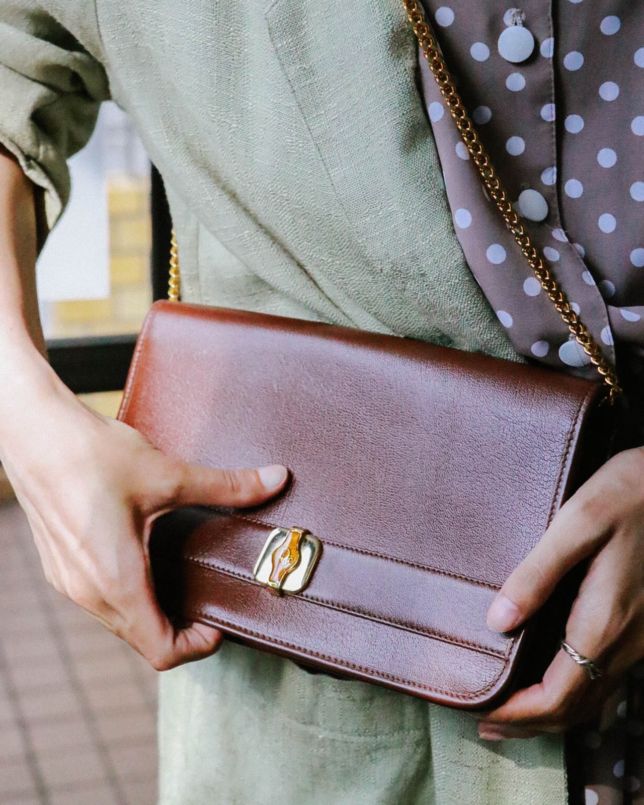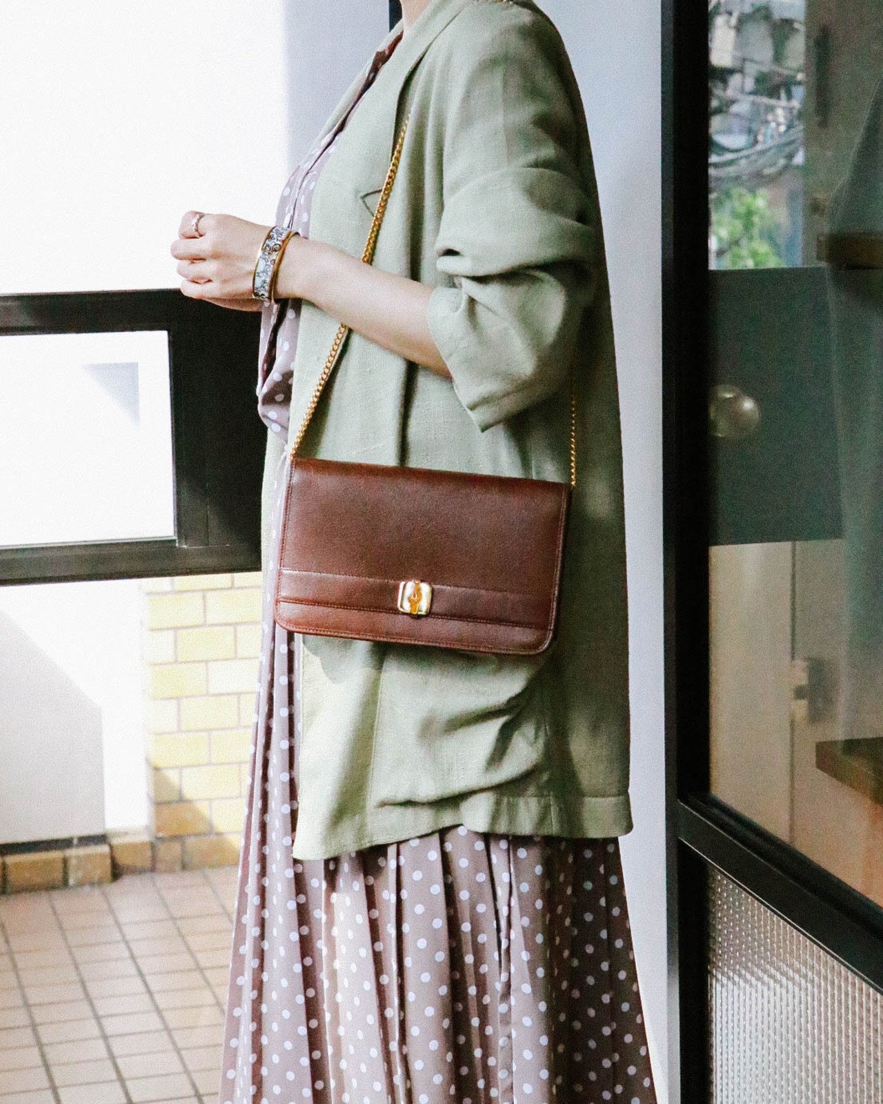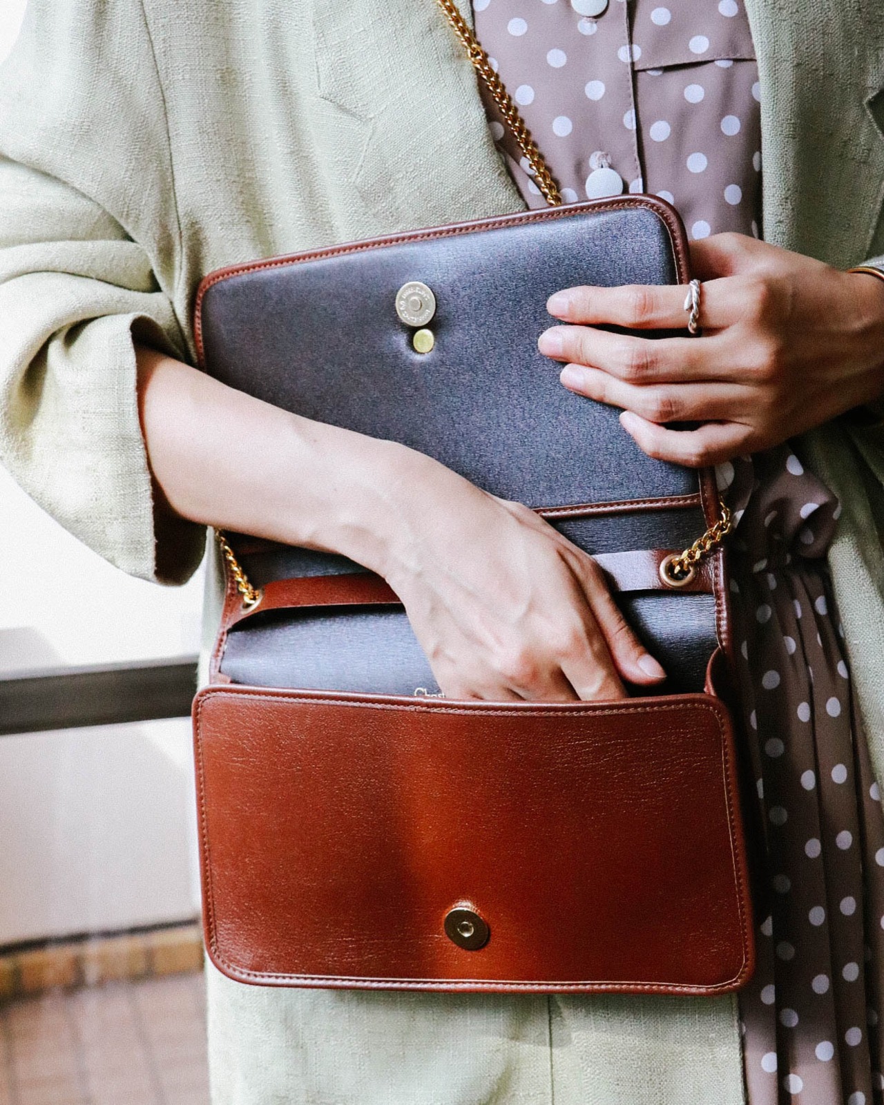ベーシックカラーのシンプルさにチェーンの華やかさが加わりいいアクセントに。