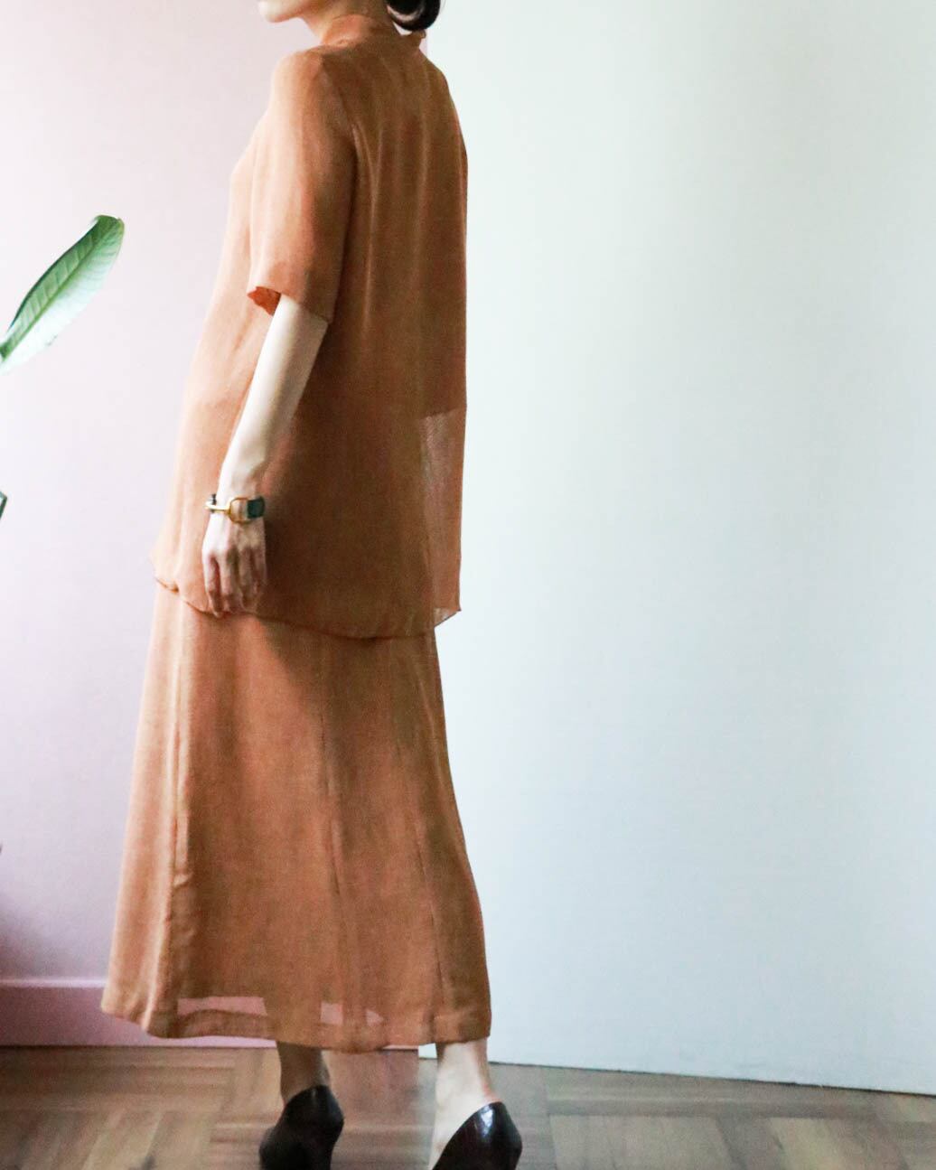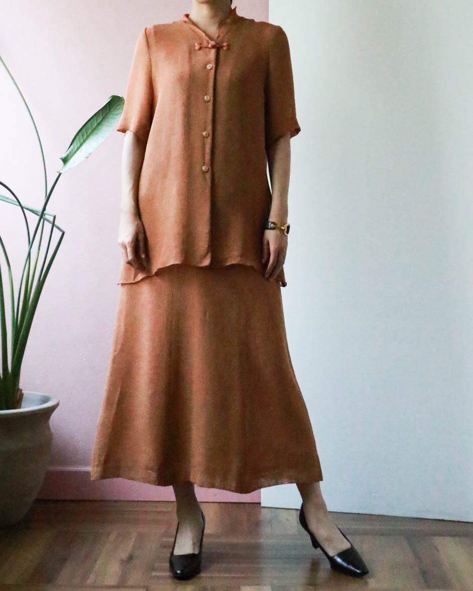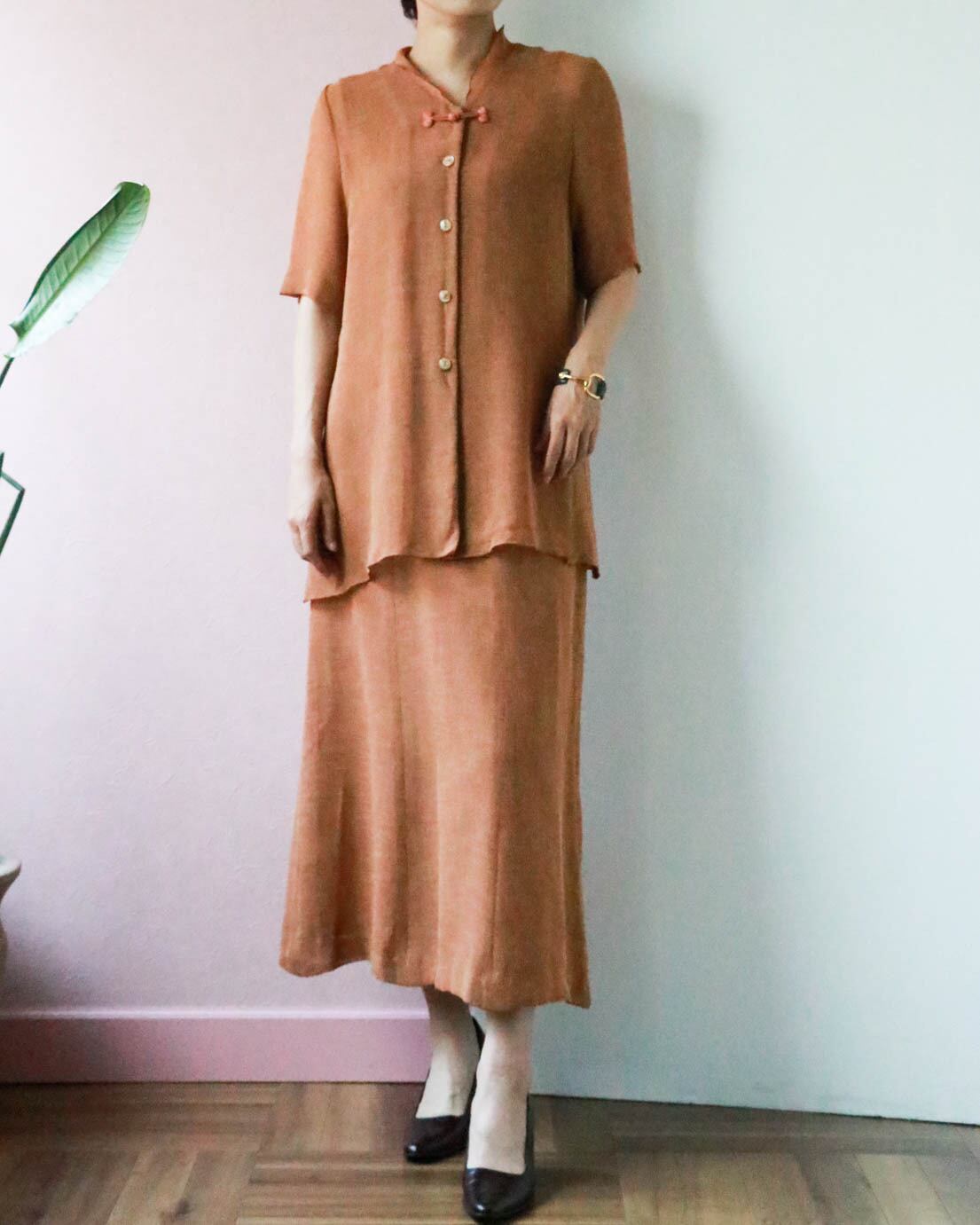 ヒップにかかるゆったりボディーの半袖チャイナー風シャツに、裏地がしっかりとついたゴムウエストのロングスカートとノースリーブのインナーでとってもリラックスした着心地。