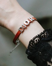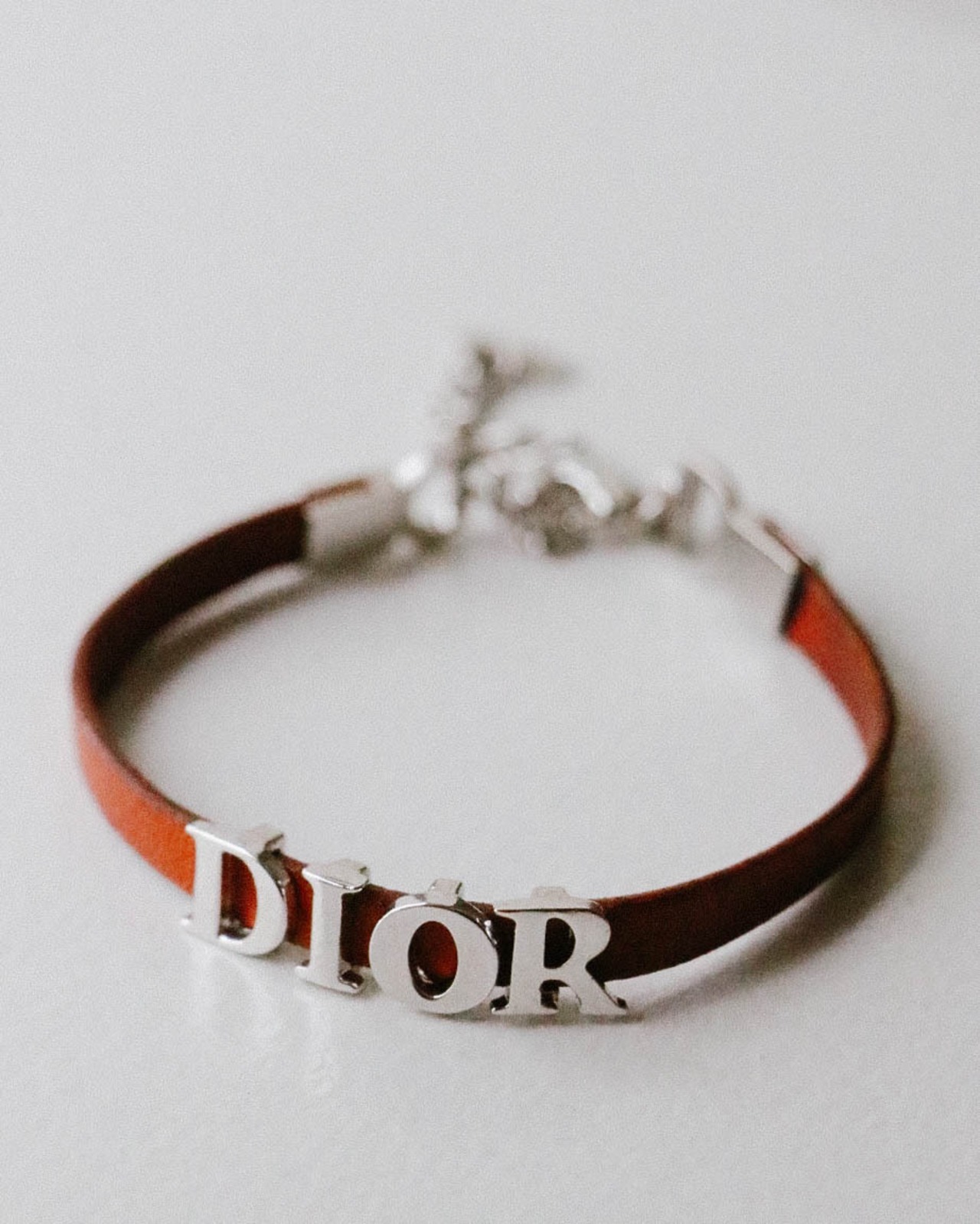 DIORのシルバーロゴのインパクトとそれを際立たせるブラウンのレザーのバランスがとてもいい。素肌に流れるシルバーチェーンが優美です。