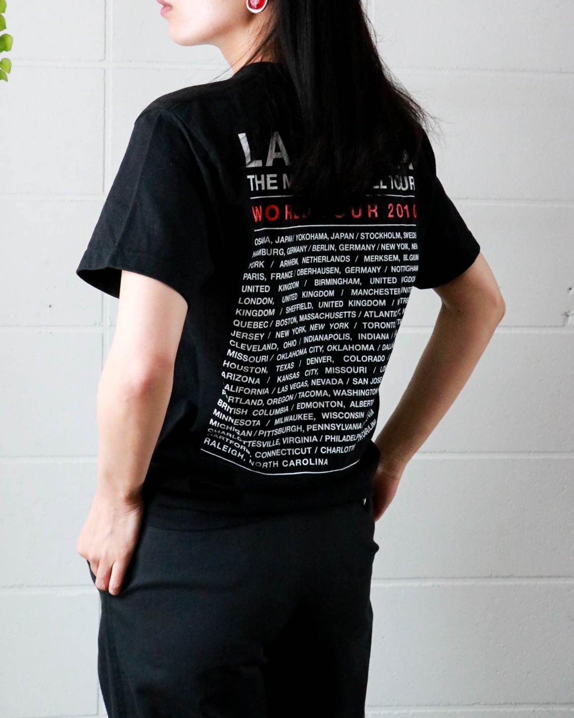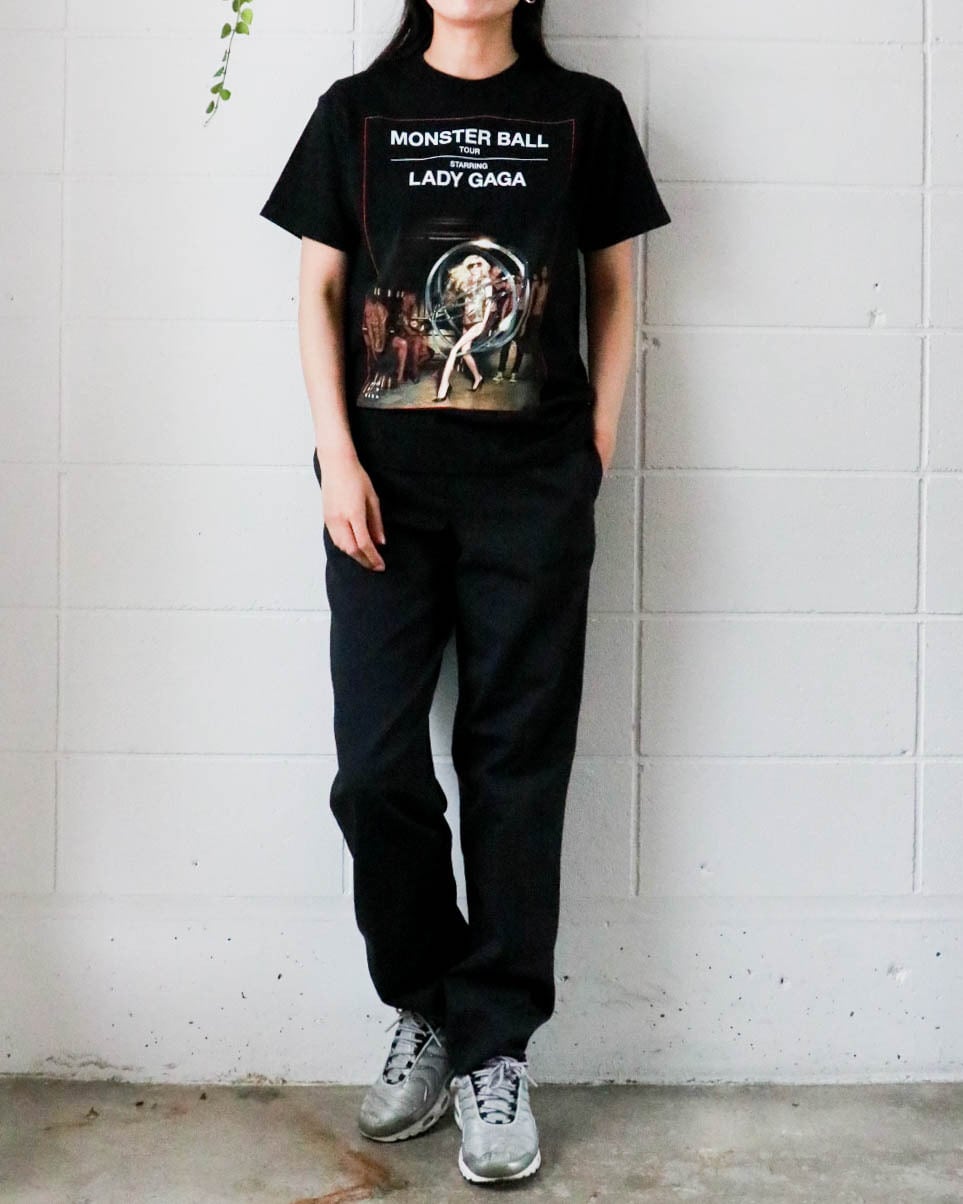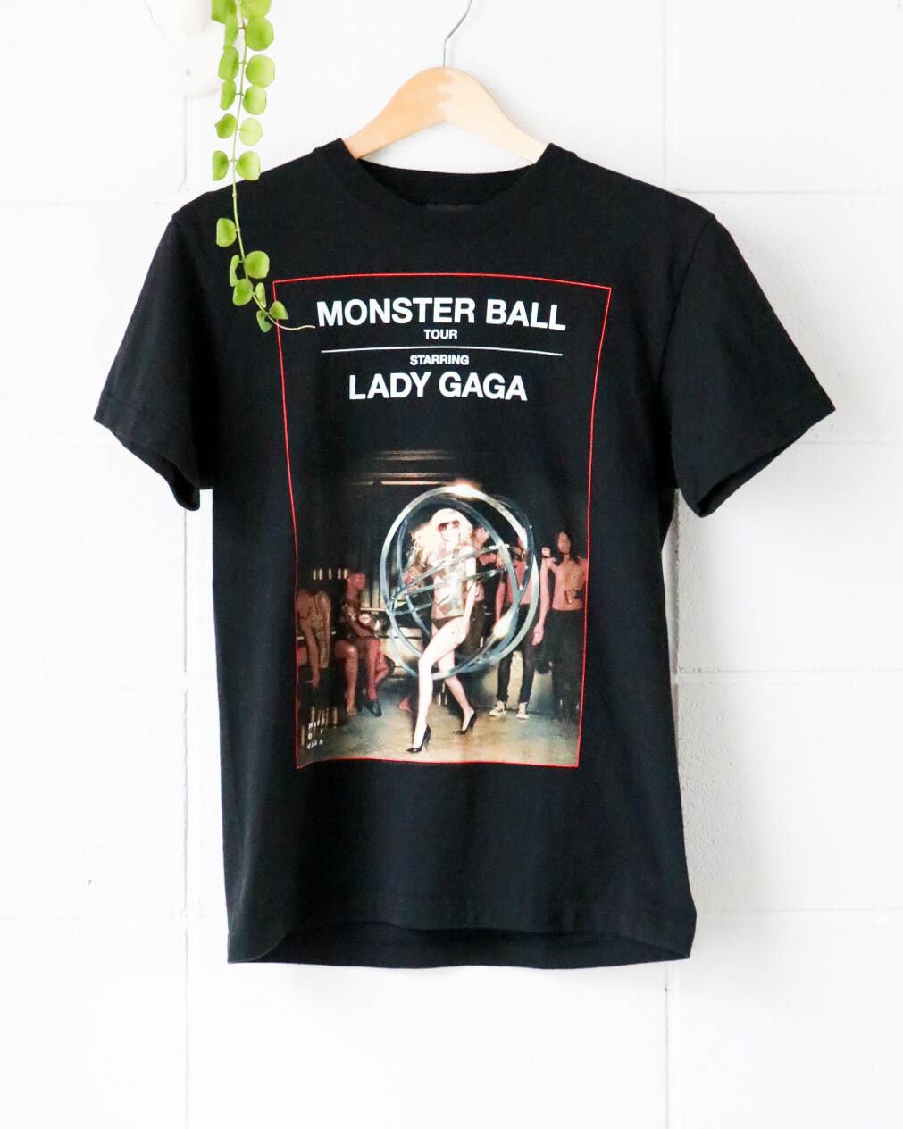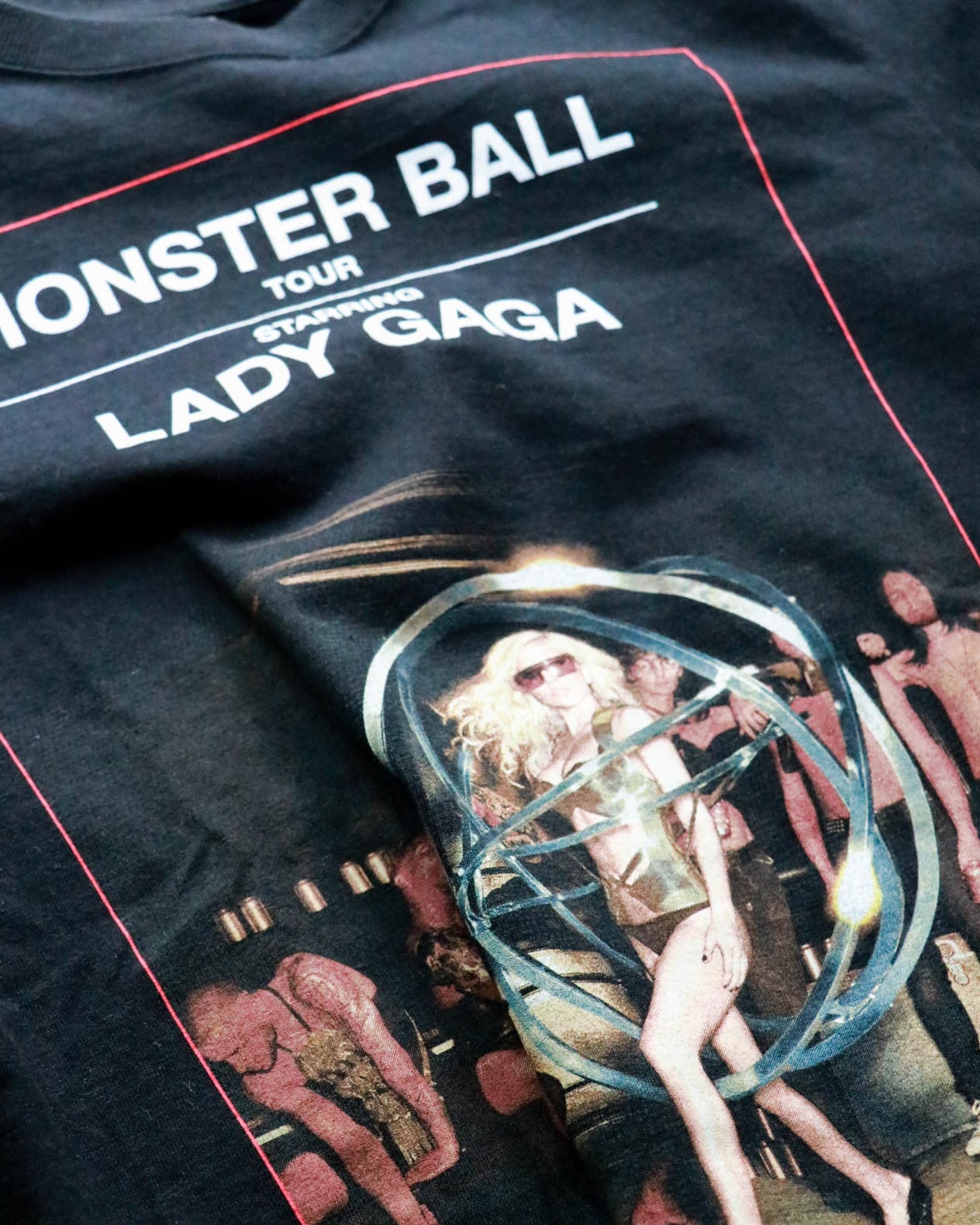 レディーガガの12年前のモンスターボールツアーTシャツ。探しているファン方も多く、世の早さを感じる。ボディはしっかりとしたコットン素材。ブラックTシャツは炭黒のように落ちていく経年劣化も醍醐味。共に育てていきたい一着です。