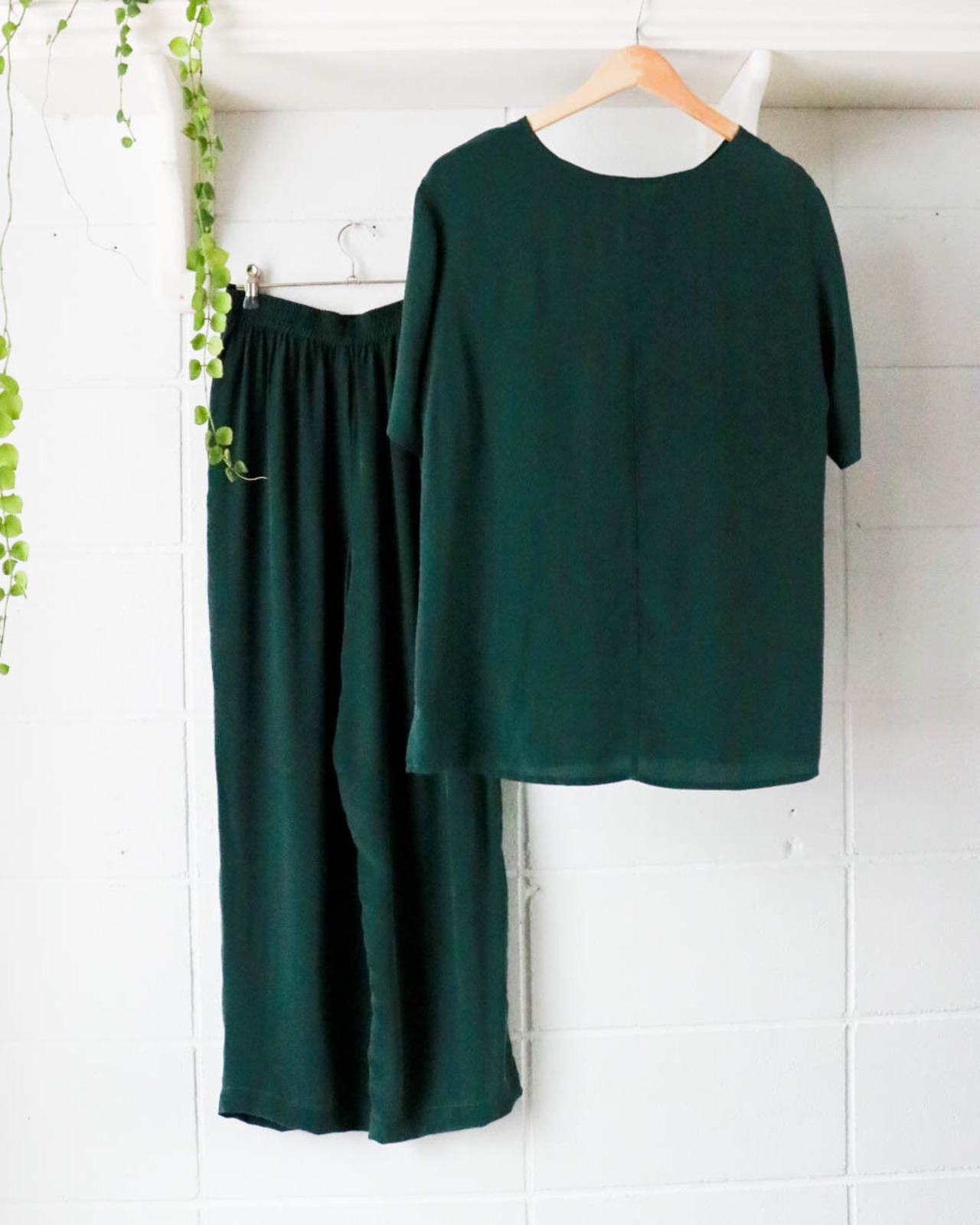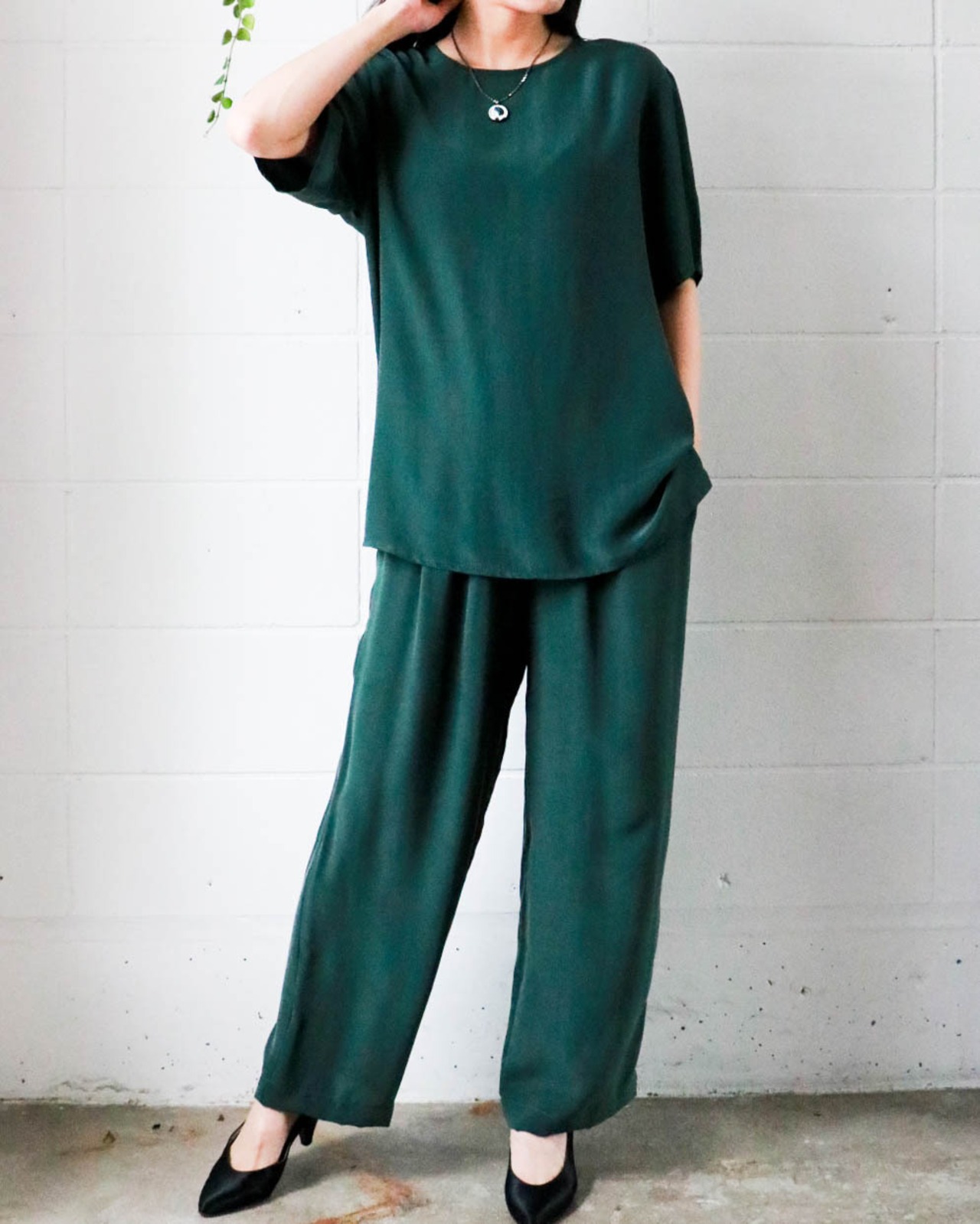 ボディーラインを強調しないトップスに、ゴムウエストのイージーパンツでリラックスムード全開。ですが、素材感や色味のおかげでカジュアルになりすぎず、ベルトをプラスしてパーティーシーンなどでも着用いただけます。