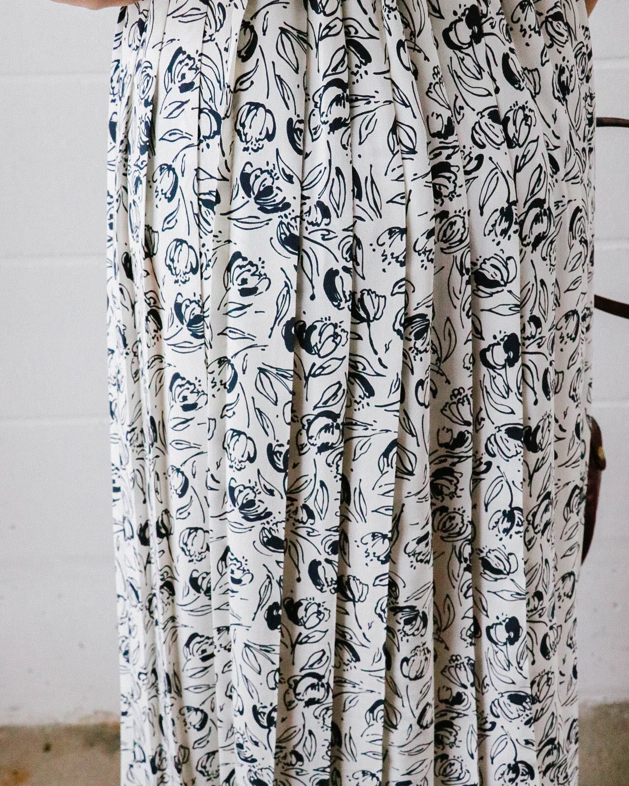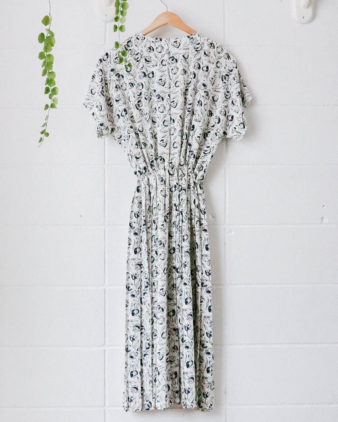 白ベースにブラックのチューリップモチーフのプリーツドレスが入荷。腰まわりからふんわりとしたプリーツのバランスがとことんフェミニンな一着。写真の様にドレッシーなパンプスはもちろん、デイリーにはくたっとした白コンバースなどと合わせて着るのもおすすめ。
