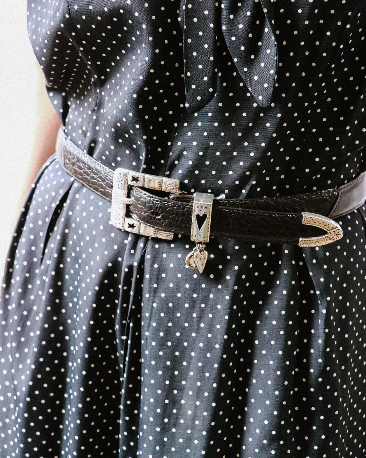探そうと思ってもこれという一本と中々出会えないセンスあるベルトは、ヴィンテージをチョイスするのがオススメ。こちらのベルト、バックルにちょこんとあしらわれたチャームが揺れてかわいい。程よい太さでボトムスに合わせるのはもちろんウエストマークにも◎