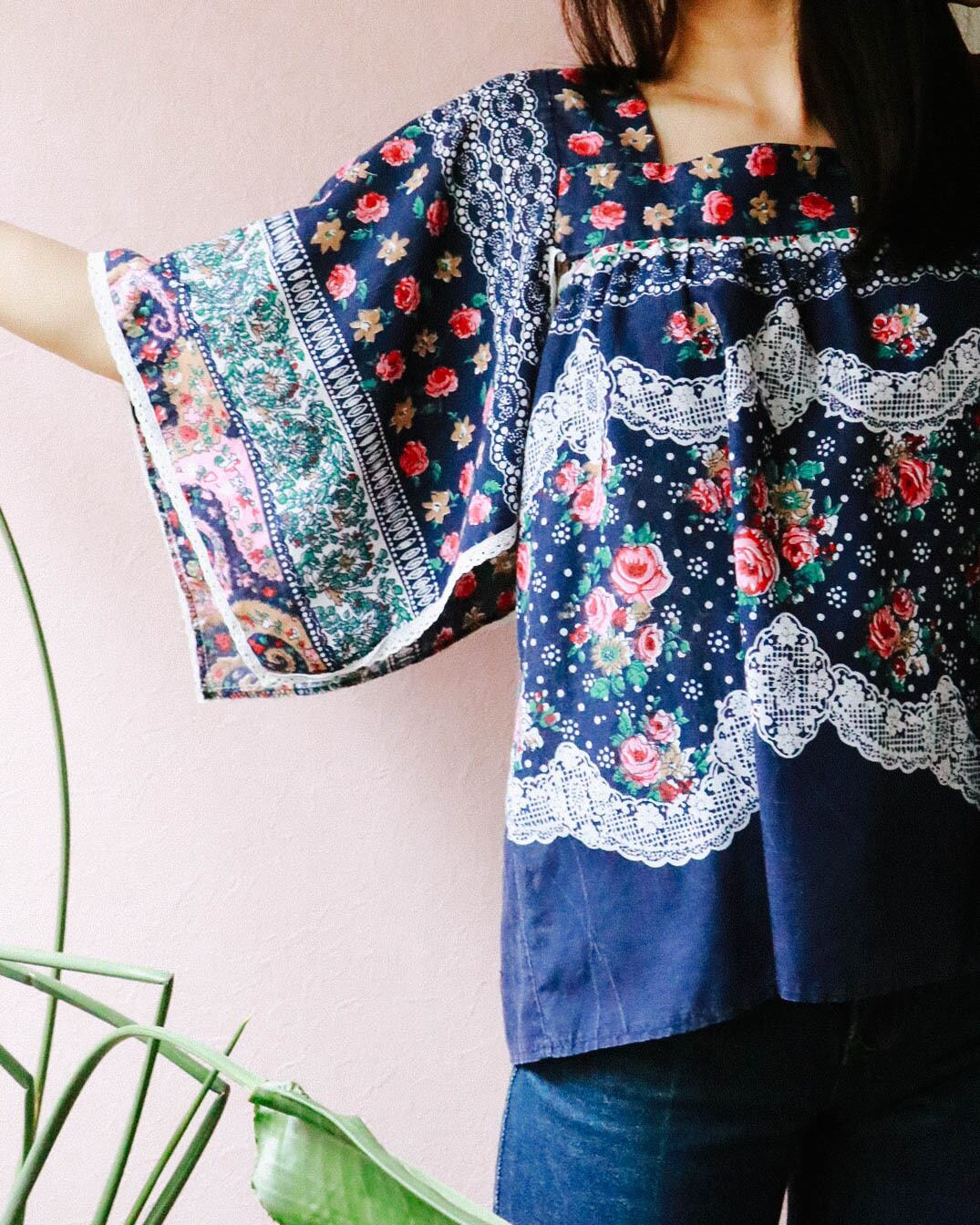 袖は着物スリーブ!流線が優美、腕を上げるとボックスシルエットになるのも表情豊かで面白い。肘下まで覆ってくれながらも脇下のカッティングで涼やかに過ごせる。また、インもアウトもしやすいバランスのとりやすい丈は重宝します。ヴィンテージの良さ実感する一着。