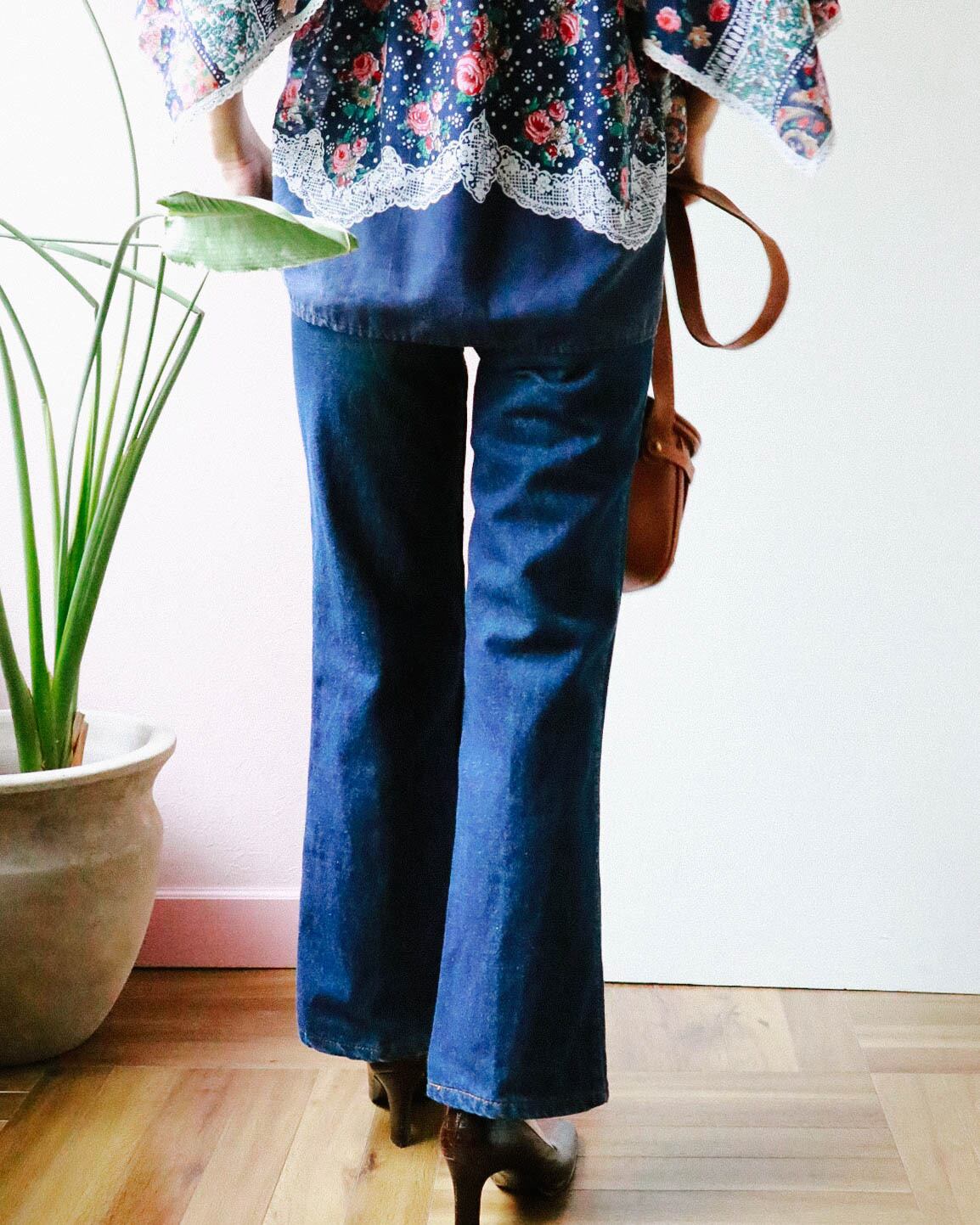 ハイライズのフレアシルエットで1970年代らしいデザイン。インディゴカラーで綺麗目なスタイルにも合わせやすい。ヒップのパッチデザインは飛行機の刺繍でアクセントに。