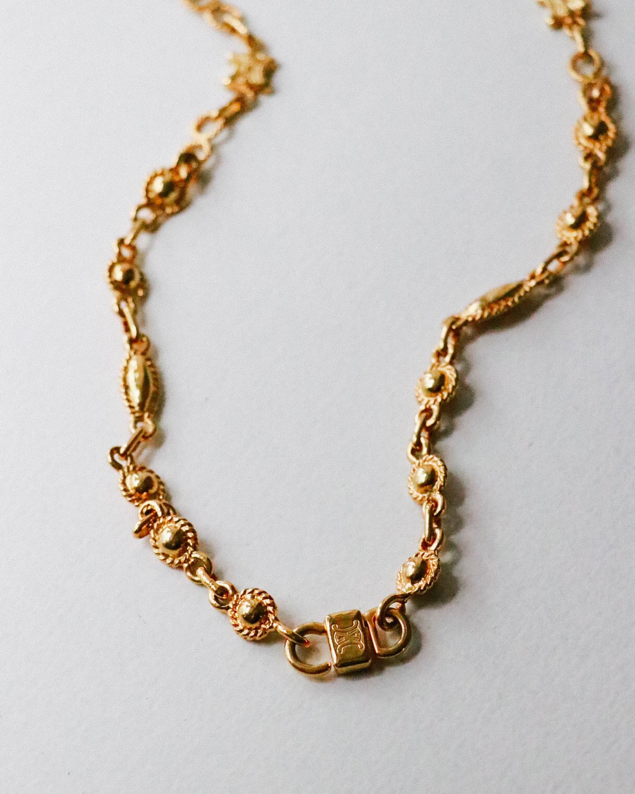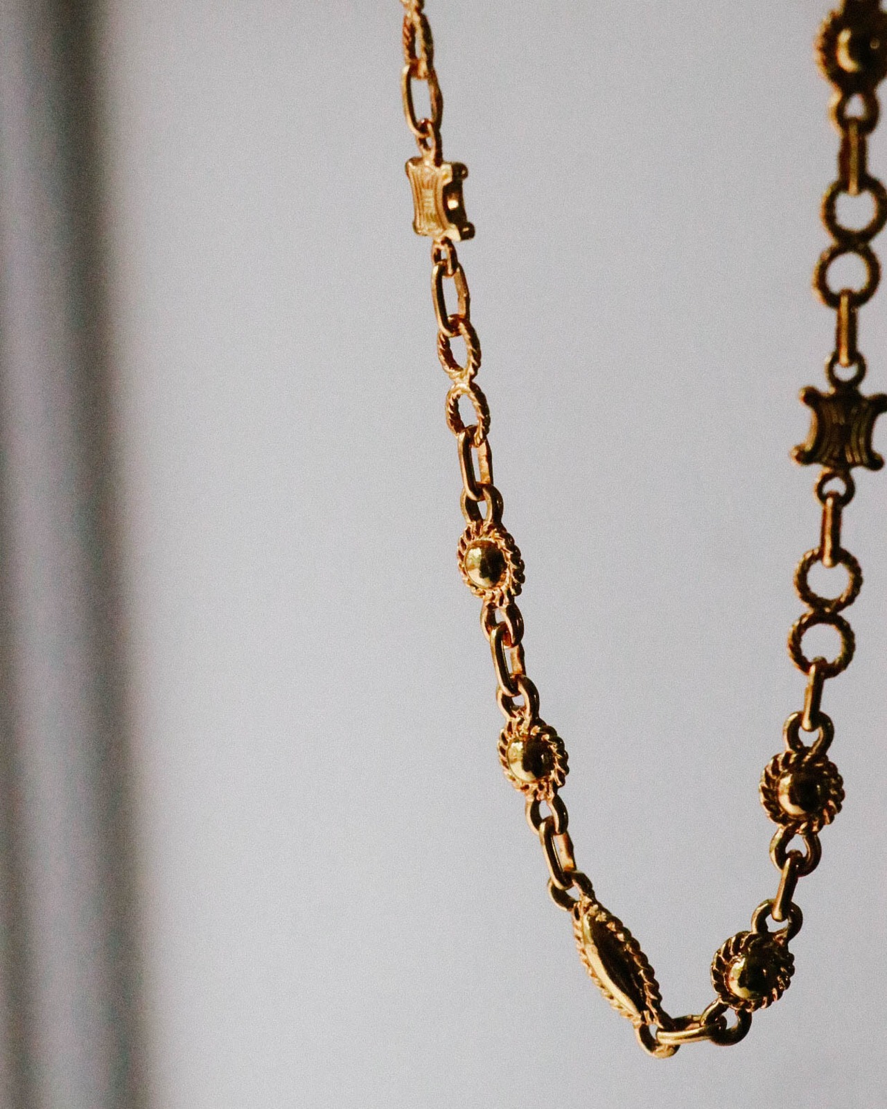 無地のプレーンなトップスやワンピースのアクセントにも大活躍!よく見ると所々に付いたCelineのロゴが他と差をつけるポイントに。手持ちのネックレスとの重ねづけも楽しみたい。