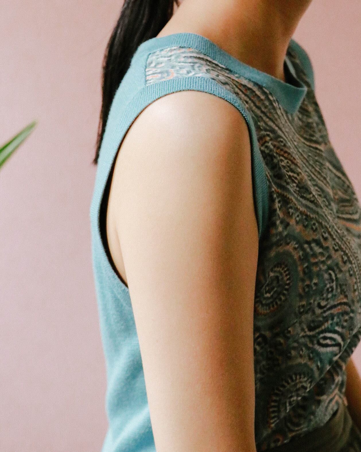 Tシャツで過ごしがちなこの季節、サマーニットのタンクトップを着て他と差をつけたい。そんな願いを叶えてくれるエトロのペーズリータンクトップ。とても柔くて軽い肌触りのシルクとレーヨンのコンビ。ターコイズブルーにペーズリーのプリントがとっても可愛い一着。このまま一枚で着るのはもちろん、サマーシャツやジャケットのインナーにしたり、秋冬はニットに重ねても可愛いので、幅広いスタイリングを楽しめるトップスです。