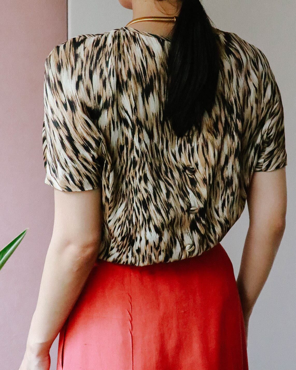 クリスチャンディオールの半袖シルクブラウス。バックスボタンスタイルでフロントをすっきりさせたミニマルなデザイン。写真の様にスカートに合わせたフェミニンルックはもちろん、カジュアルにデニムパンツと合わせたスタイリングもブラウスの良さを引き出せておすすめです。