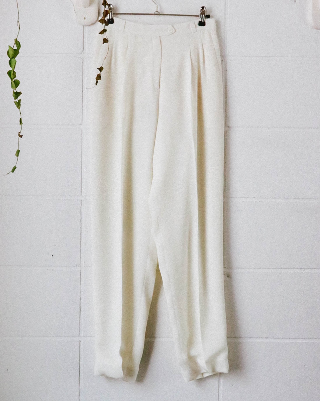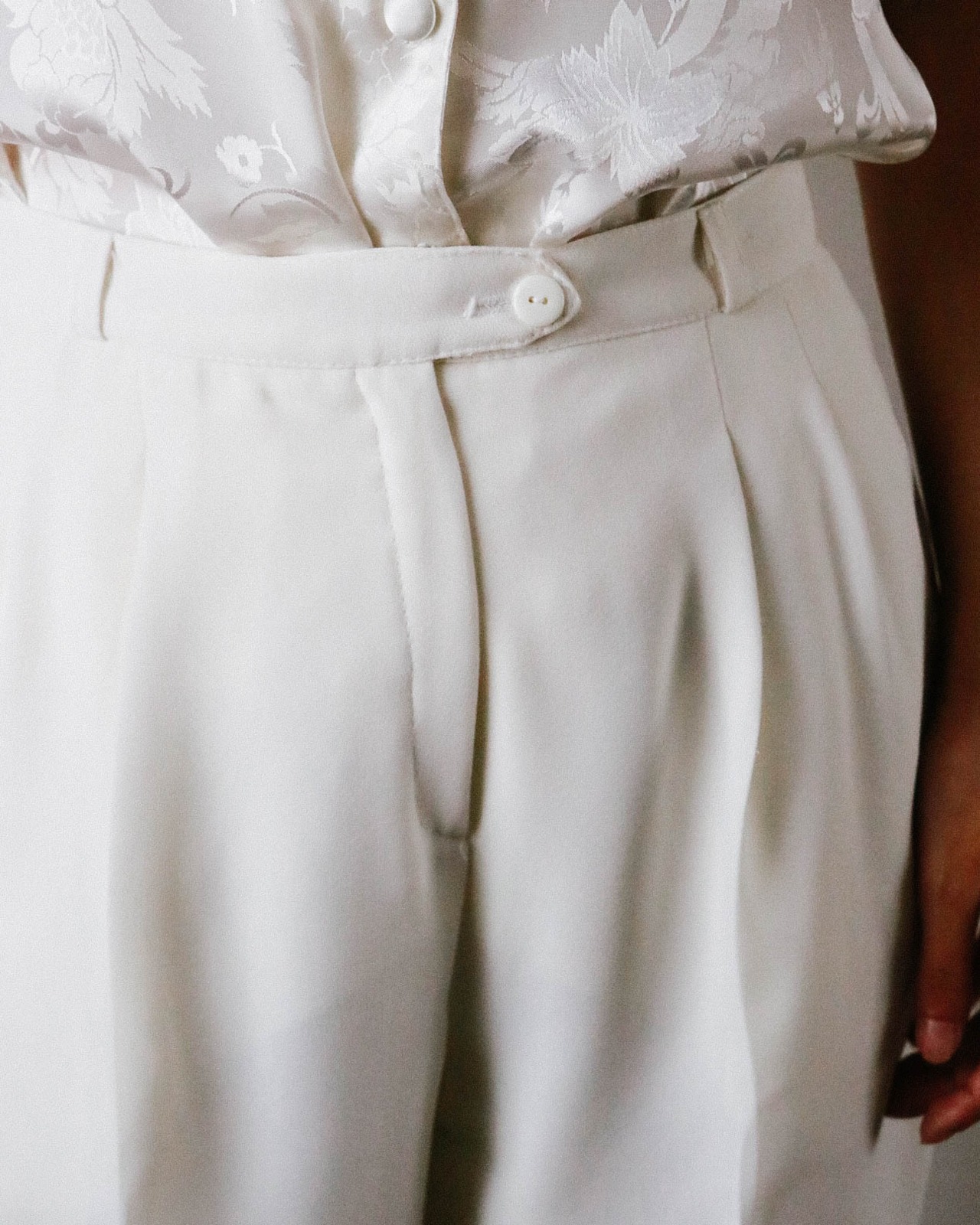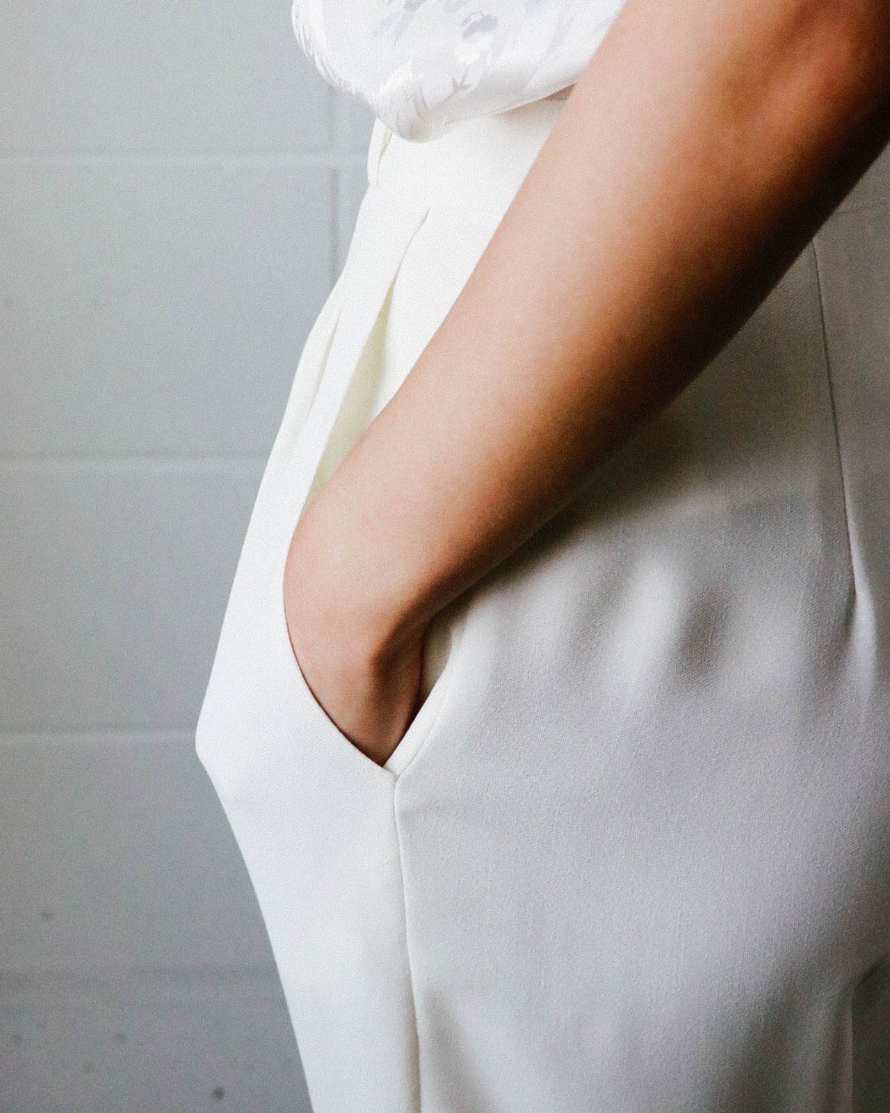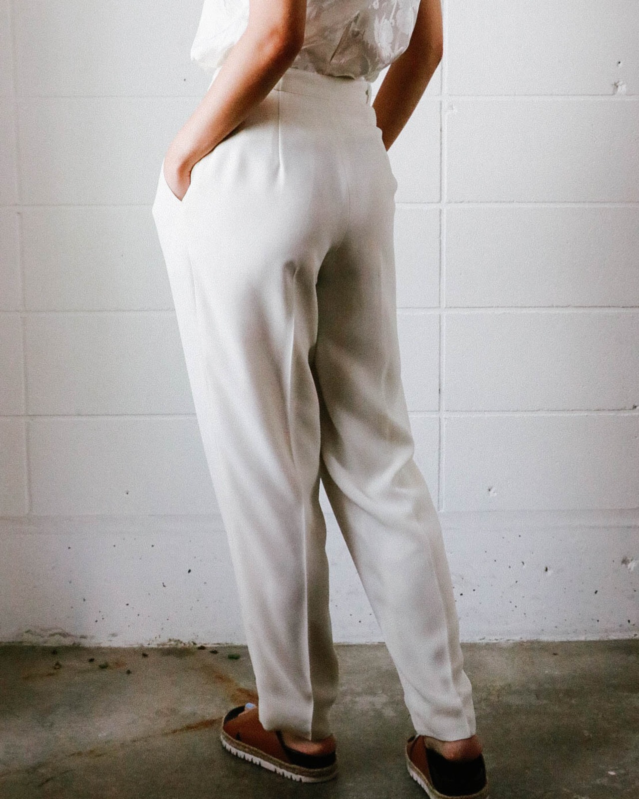 春夏のワードローブに一本は揃えておきたいホワイトパンツ。真っ白ではなく、ほんのりと黄味がかったクリームのような色味が柔らかな女性らしさを演出。ウエストはダブルタックにサイドポケットが付いたミニマムでエレガントなディテールで今の気分にハマるパンツ。