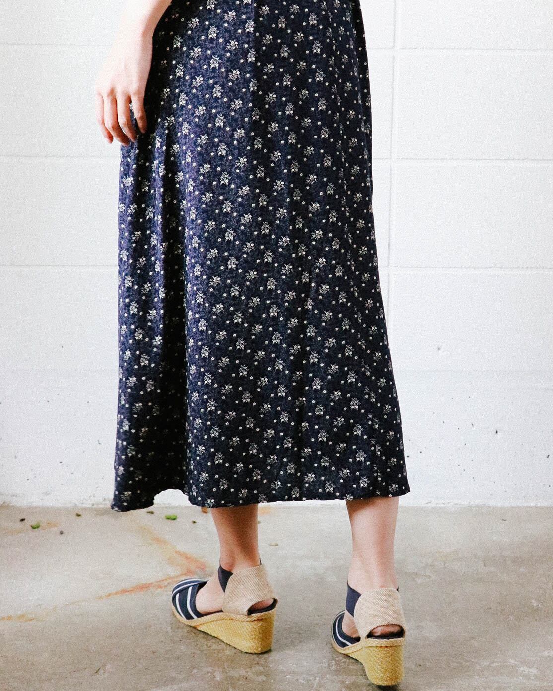 小花柄の可愛らしさにネイビーの落ち着いたトーンで大人フェミニンを叶えてくれます。首元のレースもポイントでキュンとする一着。