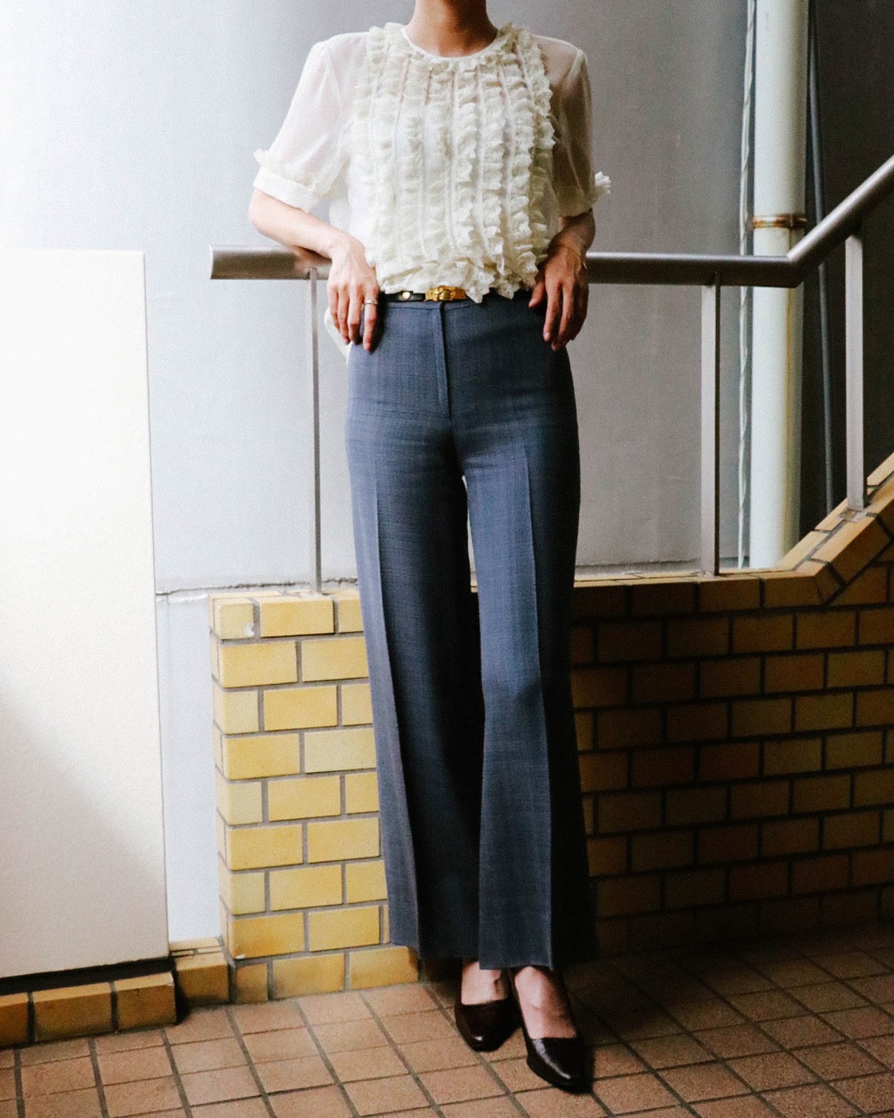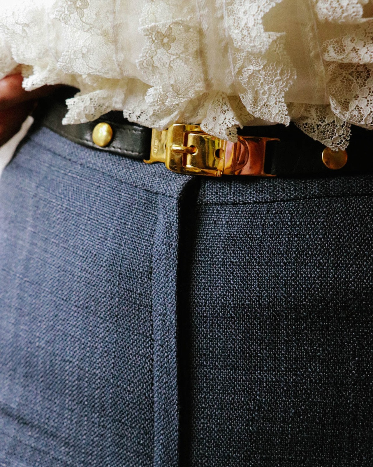 ウエストには取り外しが可能なゴールドとレザーの細ベルト。