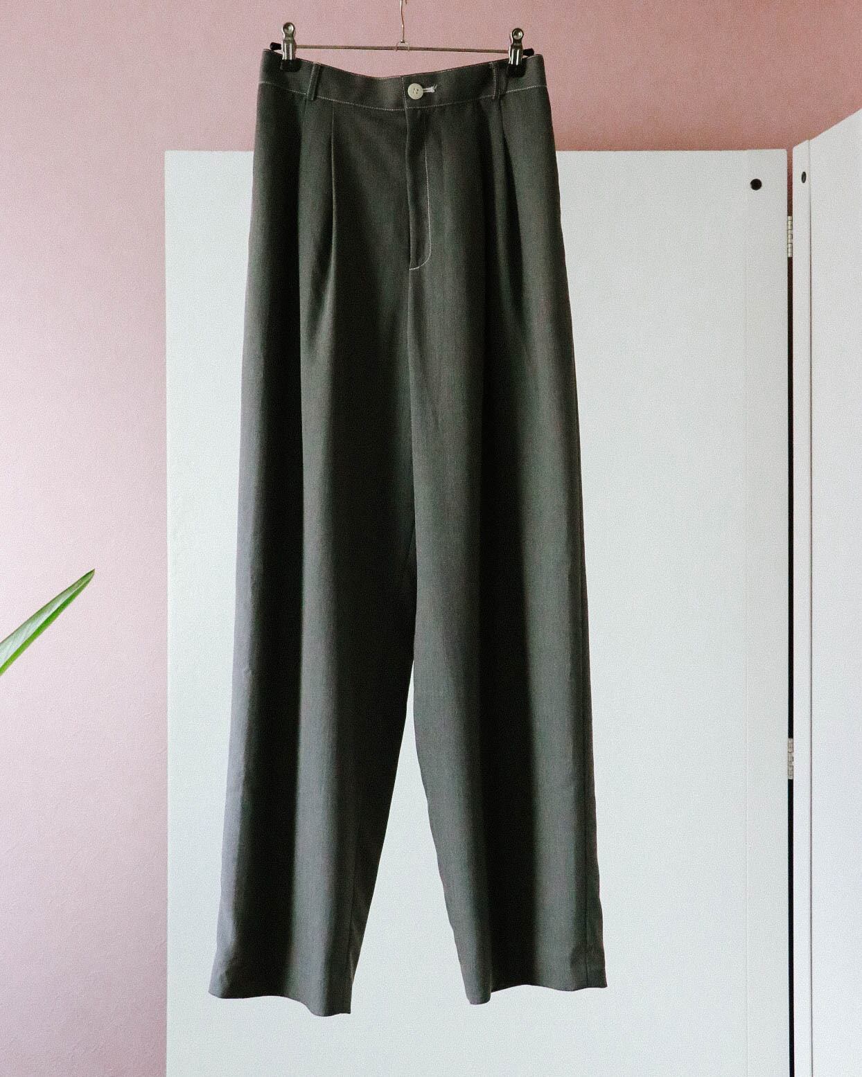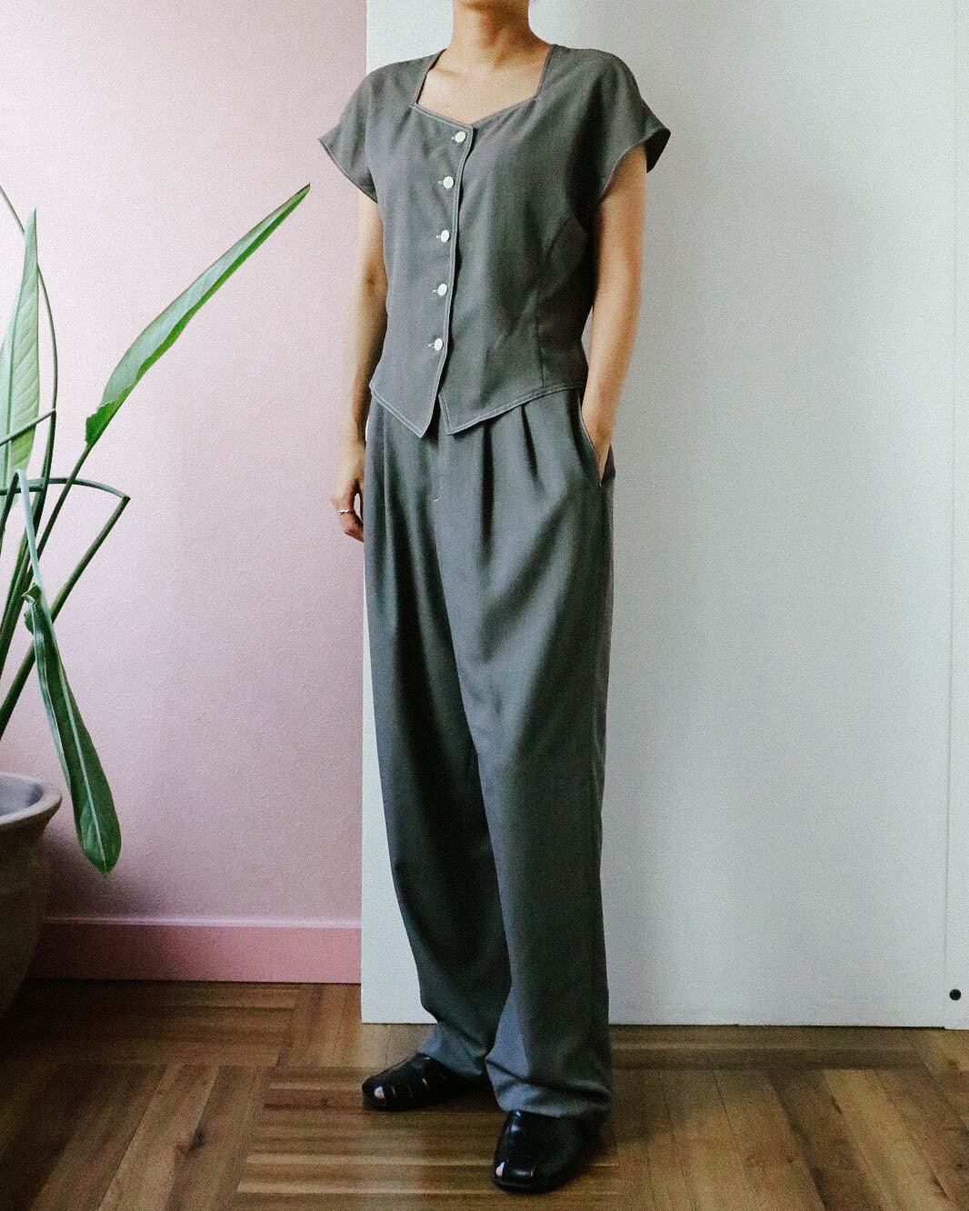 ショート丈のボタンブラウスとハイウエストパンツのセットアップです。