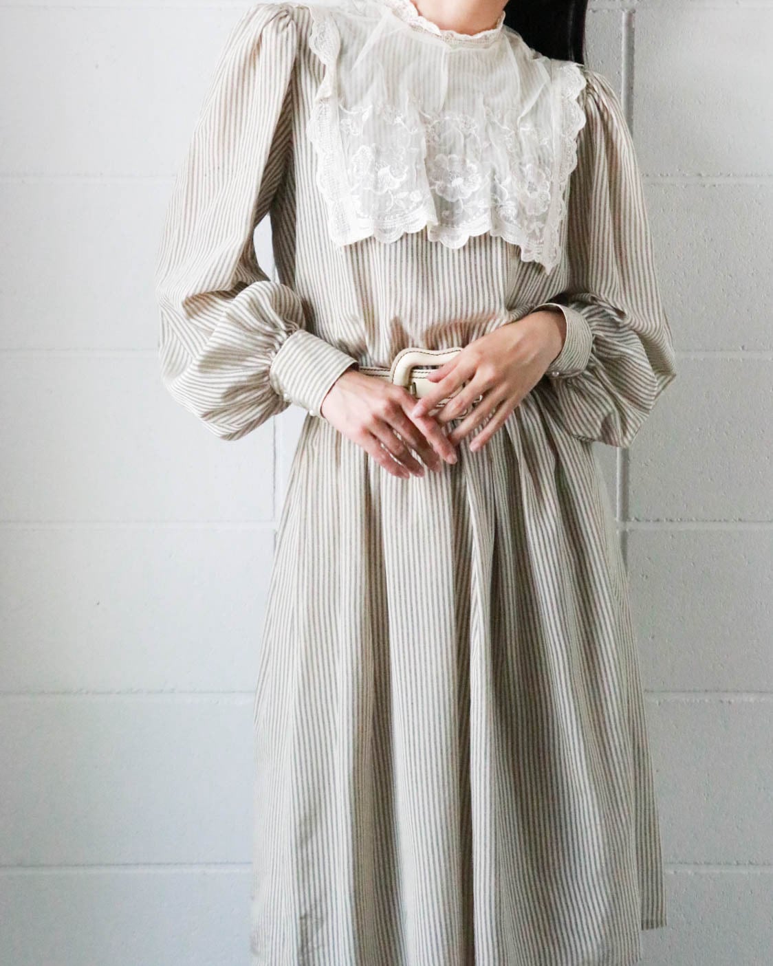 つけ襟のような繊細なレースのカラー、コントラストをおさえたストライプ、大人フェミニンに仕上がるSaks Fifth Avenue(サックスフィフスアベニュー)の80年代ドレスです。