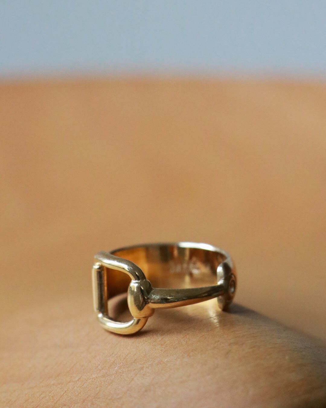スカーフの印象を一目で変えてくれるスカーフリング。こちらはホースビットデザインのGUCCIのもの。三角に畳んでリングに通して簡単に楽しめ、巻き方が難しいと言う人には特におすすめしたいアイテム。スカーフ人気の今、さりげなくコーディネートに取り入れてみてはいかがでしょうか。