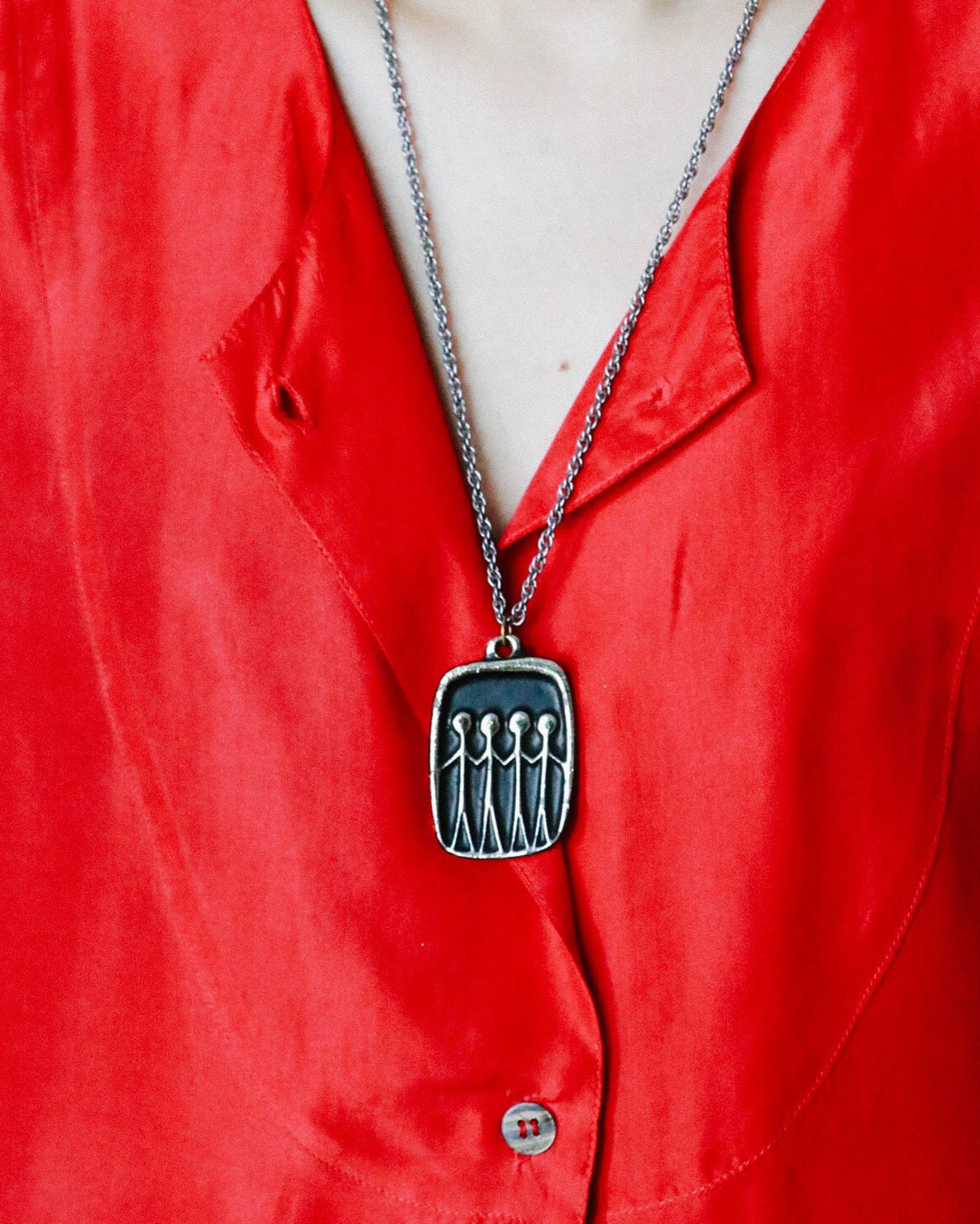 普段のコーディネートにロングネックレスをさっとつけるだけで気分アップ。こちらはシンプルなシルバーチェーンに大きなペンダントがアクセントになった一点。インパクト溢れるデザインで、一年中大活躍できます。