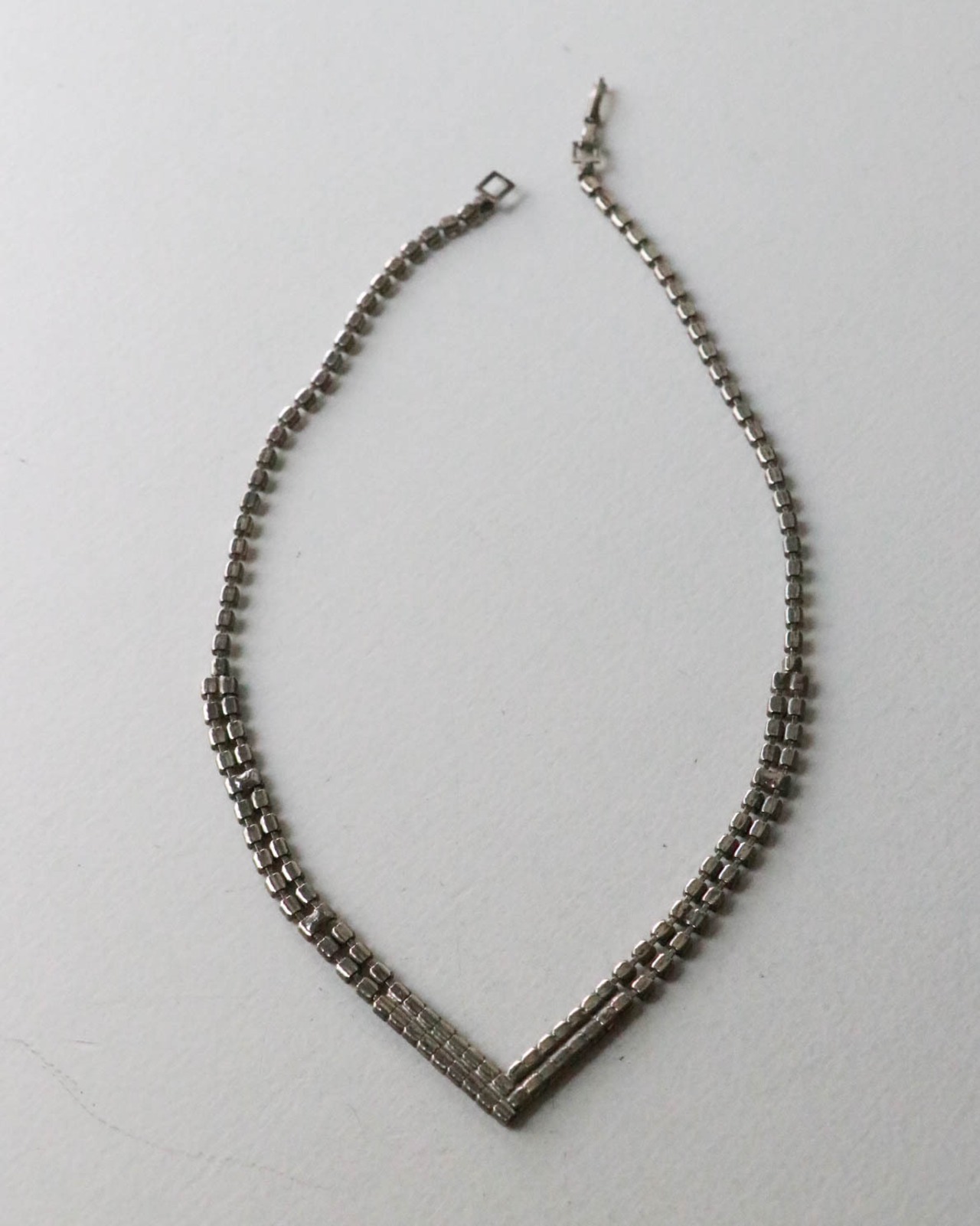 すっきりとしたV型のネックレスはブラウスとも相性抜群。