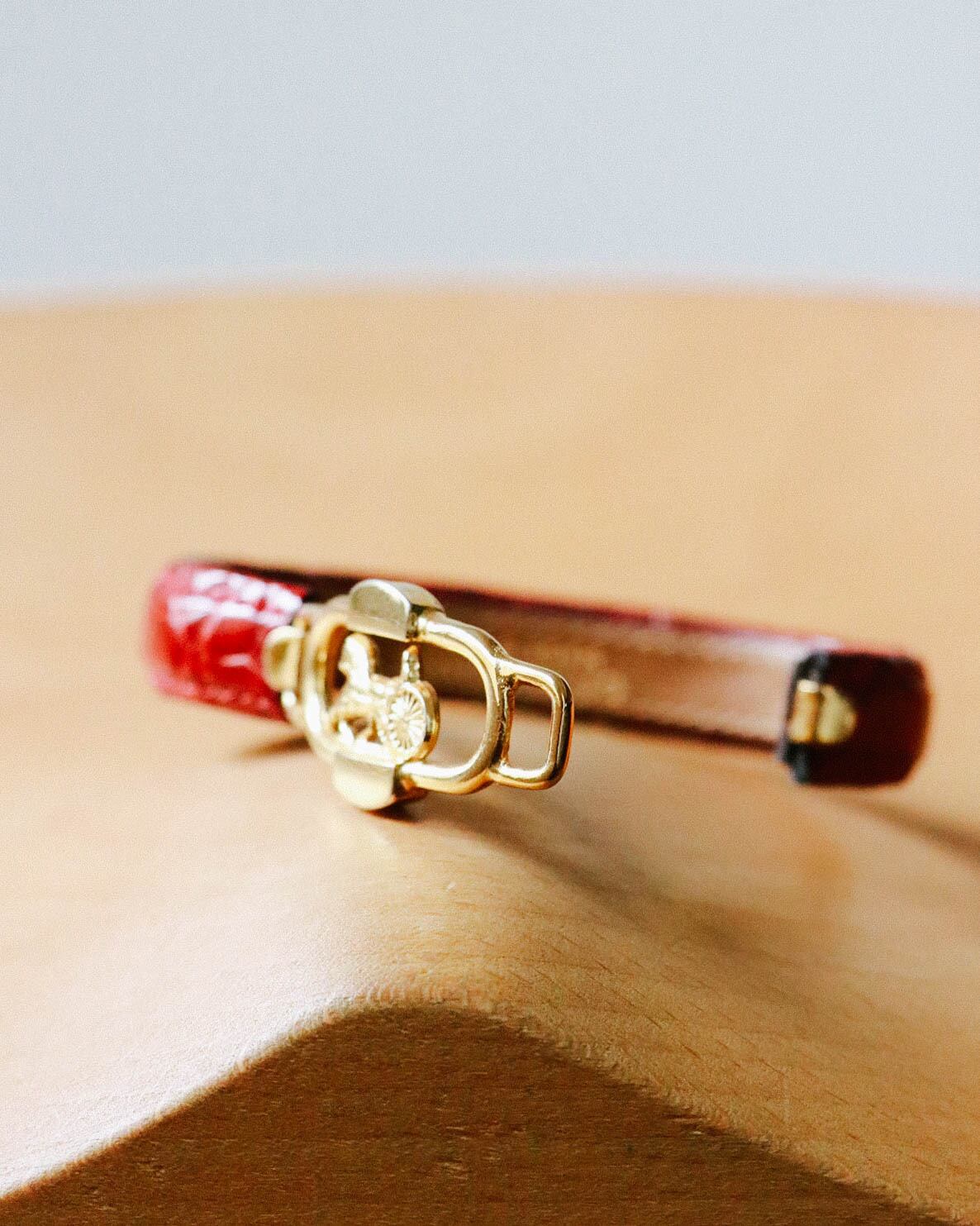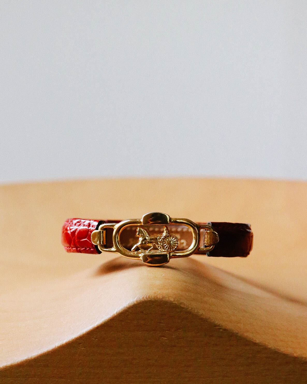 ファンの方多いブランドアイコンのひとつである馬車のチャームがポイントのセリーヌバングル。ダークレッドにゴールドのモチーフはオールドセリーヌらしいクラシカルなデザイン。シンプルなコーディネートにプラスするだけで一気に上品さアップ。秋冬は長袖ニットの上から付けてカラーのアクセントをお楽しみください。
