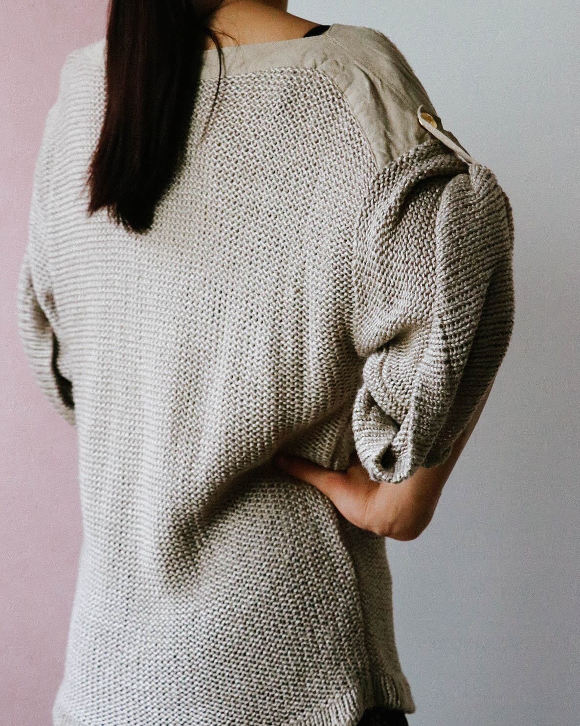 上品なベージュニットはメゾンブランドセリーヌのもの。首元はボートネックに、ボリュミーな袖。シルク100%の柔らかな着心地にゆったりとしたシルエット。エレガントな雰囲気のトップスはボトムズを柄物で楽しめるので、長年愛用します。70年代のものですが、コンディションはきれいに残ってるので、お勧めです。