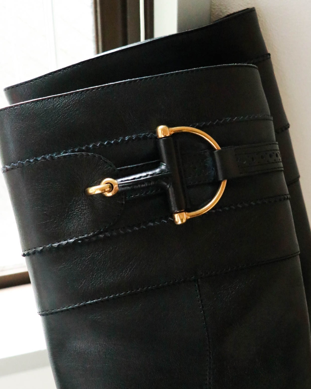 今季マストなロングブーツが入荷しました。ゼロ年代のリバイバル時代の今、まさにこちらのグッチのブーツがフィットする。ビッグサイズのホースビットやステッチデザインが特徴的。
