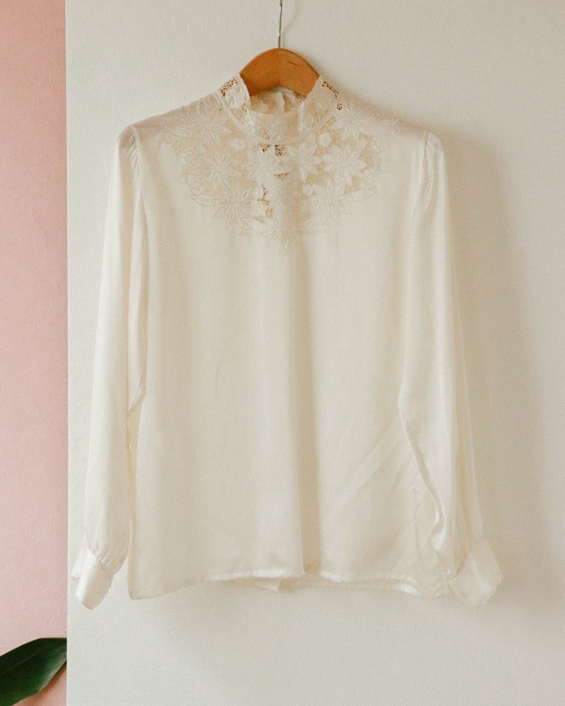 オールホワイトがロマンティックな雰囲気のシルクブラウス。ゆったりとしたシルエットとハイネック になった首元のレースが繊細なディテール。これからの季節、お好みのアウターやボトムで甘さの調節もできるので万能に使えます。