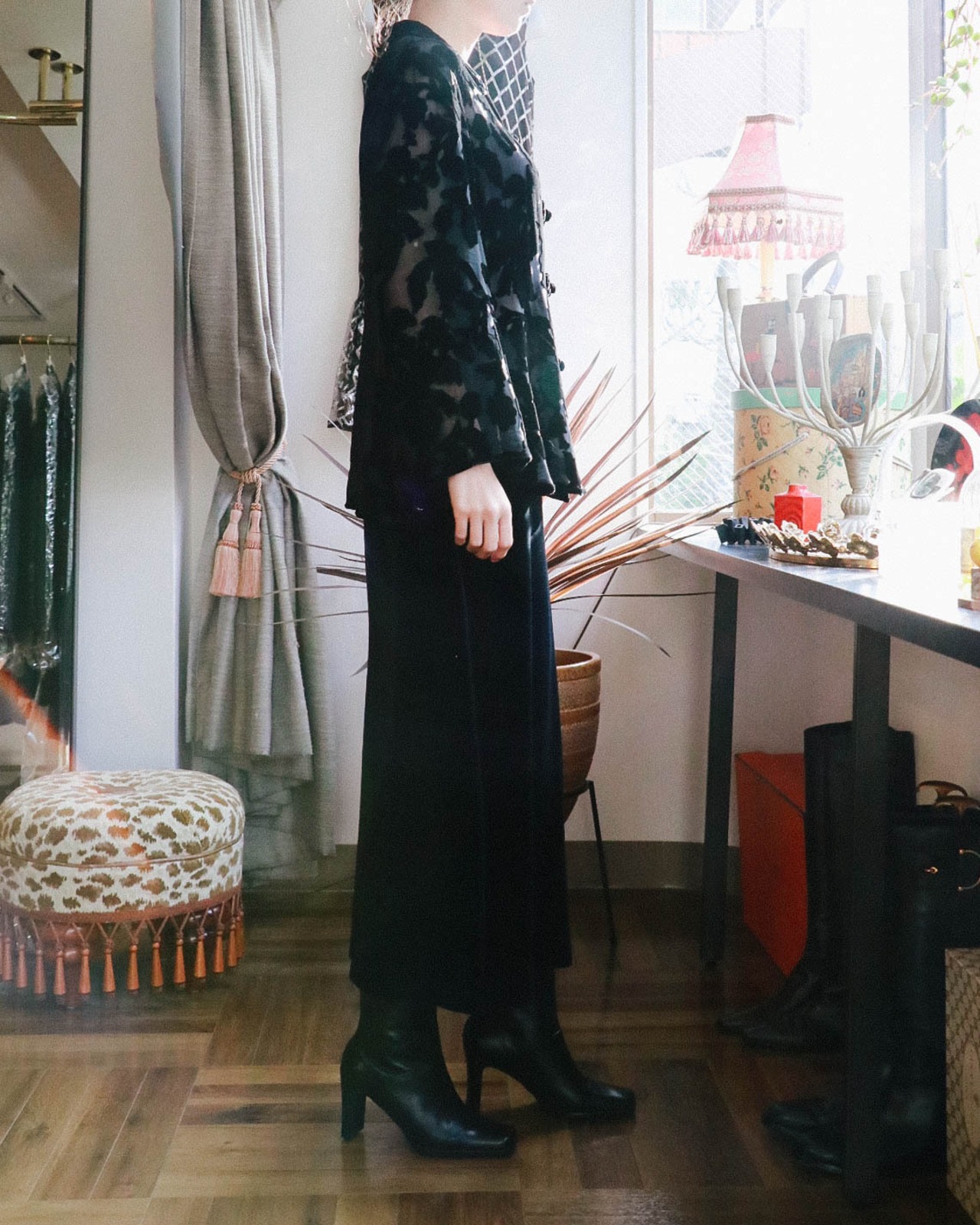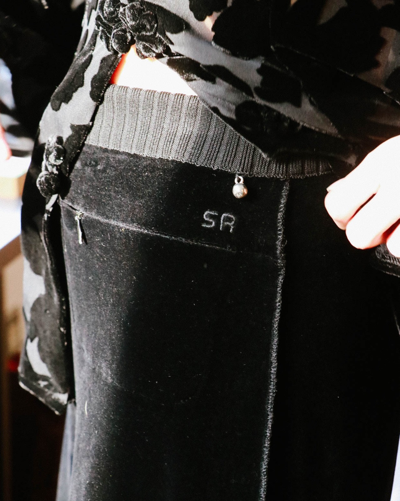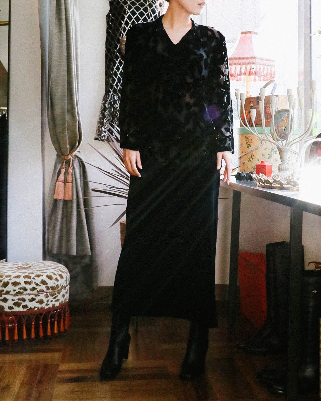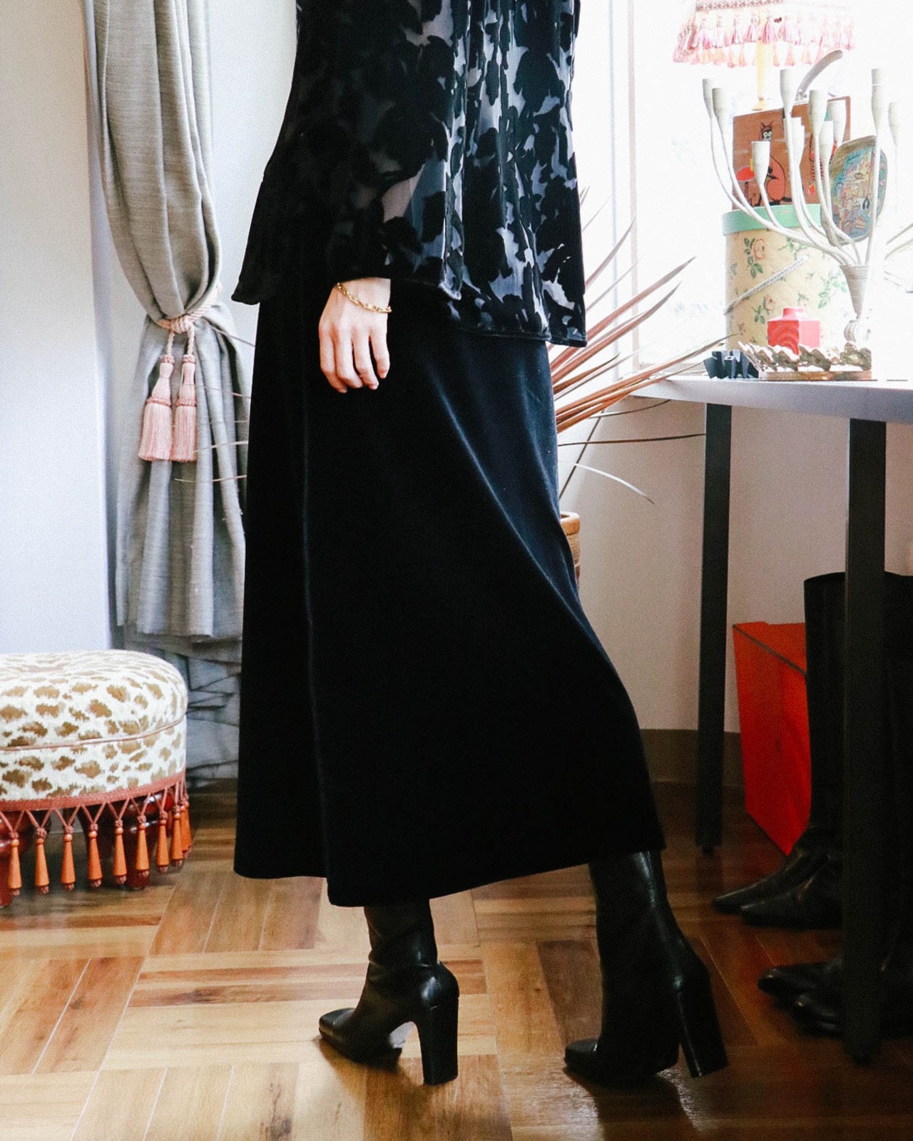 肌馴染みの良いコットンベロアを使用したロングスカートはソニアリキエルのもの。