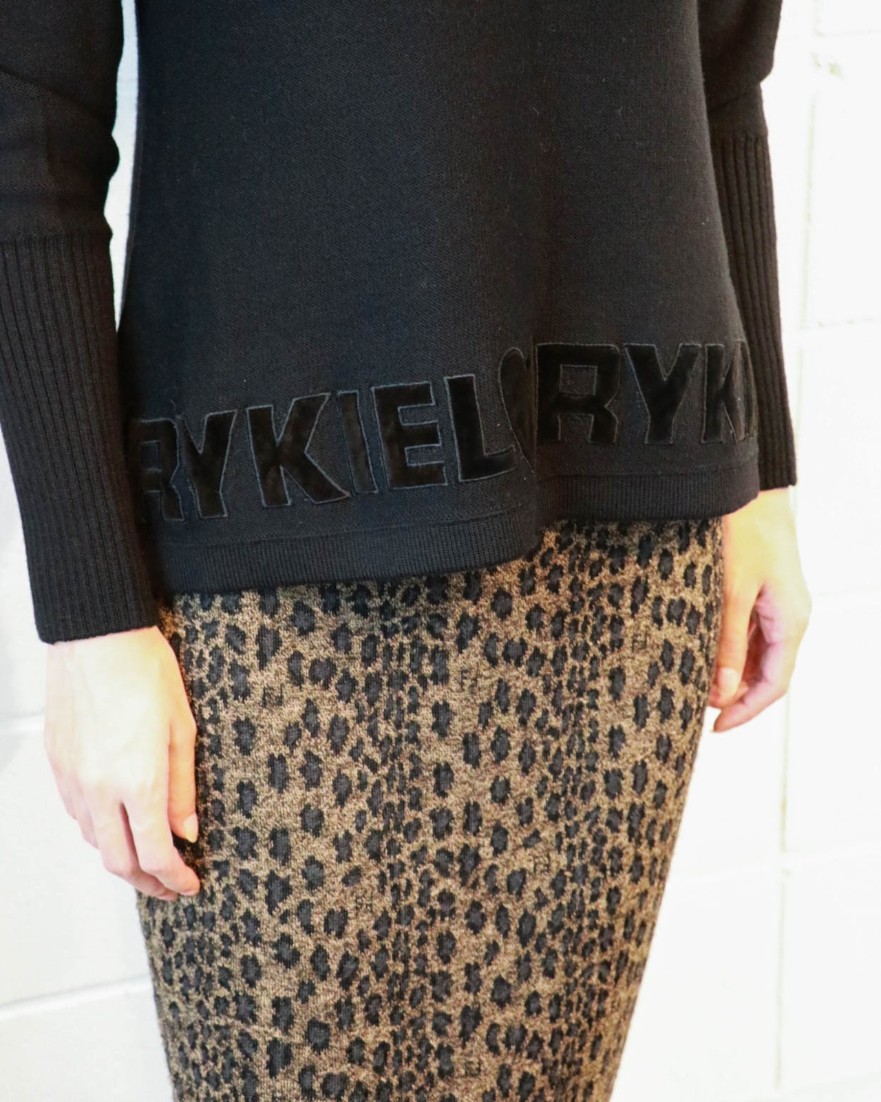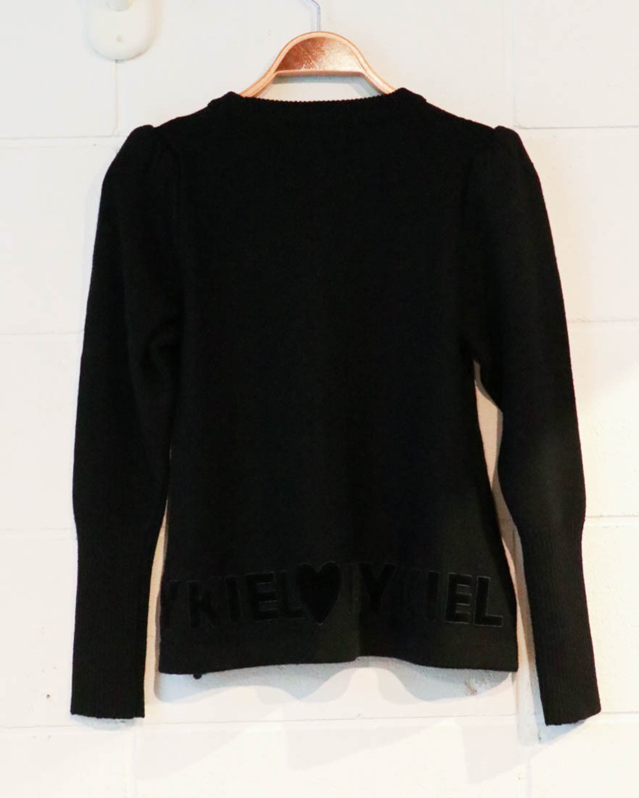 オールブラックにフェミニンなデザインのソニアリキエル セーター。クルーネックでロング丈のパフスリーブ、裾にはベロアのブランド文字やハートのカットワークが可愛らしいアクセントに。黒のニットは寒さ増すこれからの季節に用意しておきたいアイテムです。