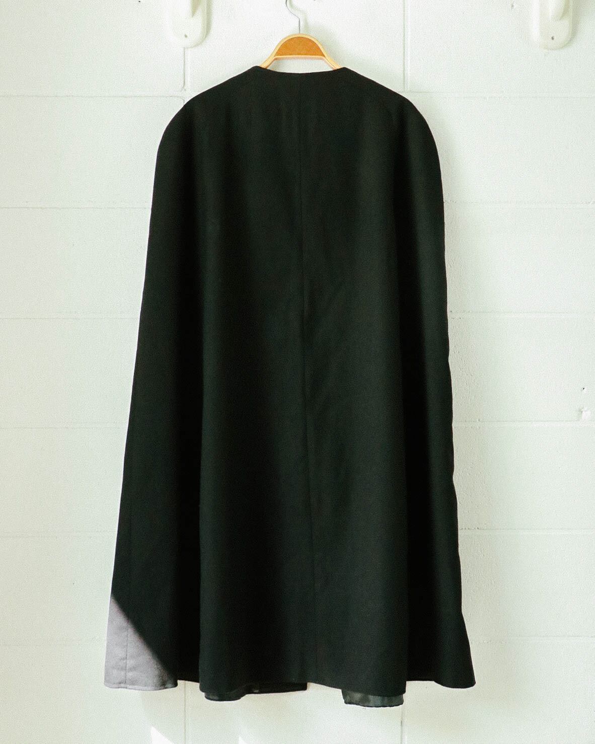 難易度が高いと思われがちなケープコートはベーシックなカラーをチョイスすれば、お手持ちのアイテムと合わせやすい。こちらは、薄手ウールの素材感にブラックカラーがクラシックな一着。袖口が広く、薄手のコートやジャケットの上から羽織ったり、お気に入りのブラウスと合わせて大人のヴィンテージスタイルもお楽しみください。