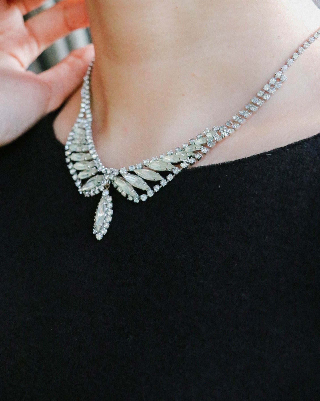 首元を華やかに彩る、雫型デザインのラインストーンネックレス。使い勝手の良い40cmチェーンなのでブラウスとも相性抜群。デザイン性の高い一点。秋冬はロマンティックなアイテムを身に纏いたくなりますね。