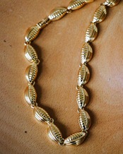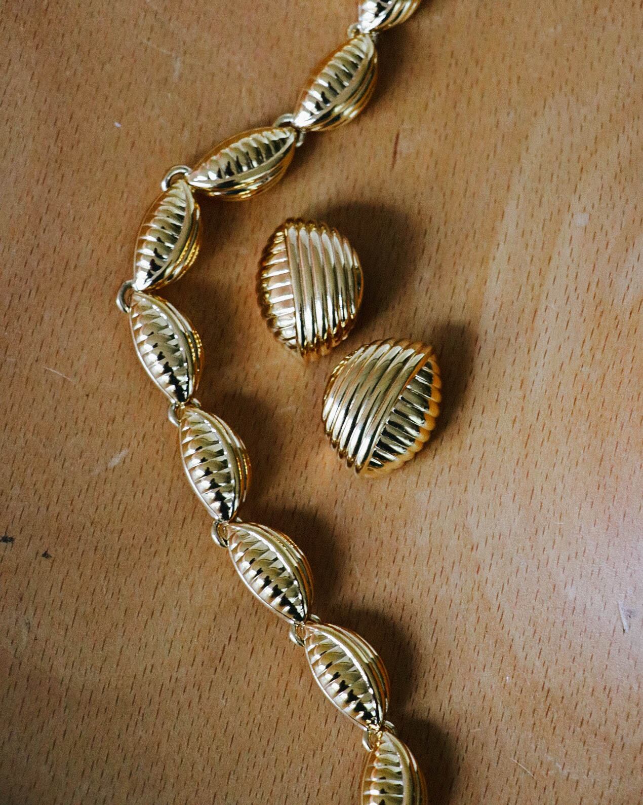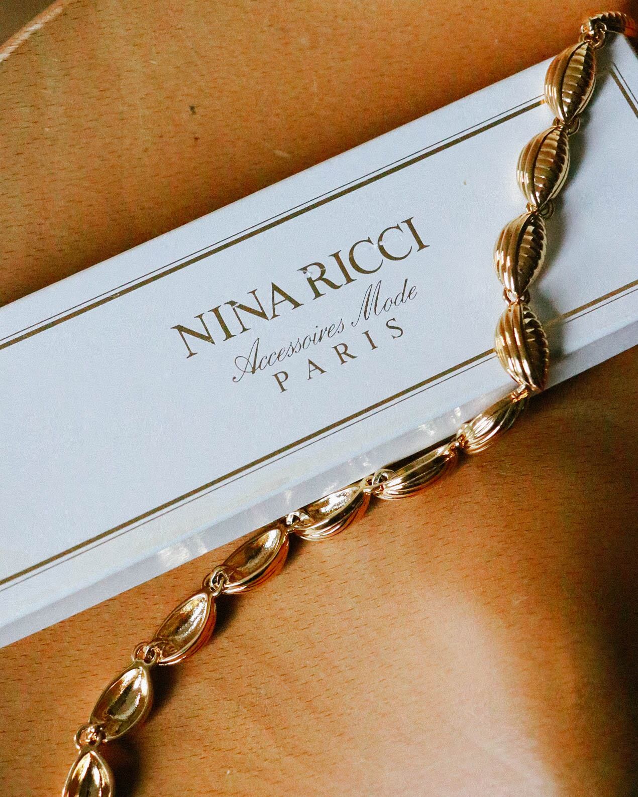 貝殻のようなモチーフの程よい存在感あるネックレスはニナリッチのもの。顔周りに華やかさを添える煌めくゴールドカラーと使いやすいデザインはデイリーにもパーティーシーンにも。別売のイヤリングとセットで統一感を楽しむのおすすめです。