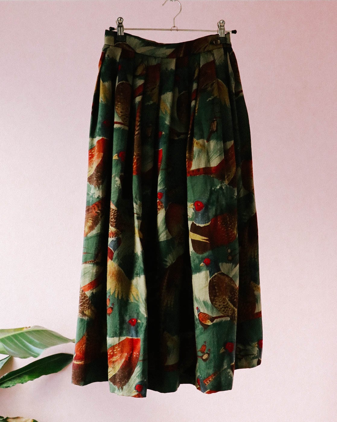 美しいシルエットに可愛い鳥モチーフのプリントが魅力的なプリーツスカート。絵画のような気品溢れる柄がラルフローレンを象徴するデザイン。トップス次第でシーンを問わず纏える優美な一着。ウエストにはサイドボタン、内側に裏地つき。