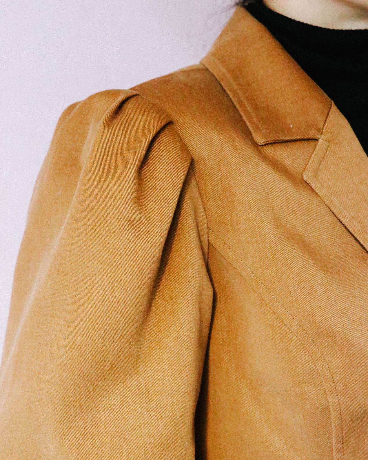 コンパクトで女性らしいシルエットやパフスリーブ、スカーフを巻いたかのような襟のデザインでバックスタイルも抜かりない、ヴィンテージの楽しさを味わえる一着。