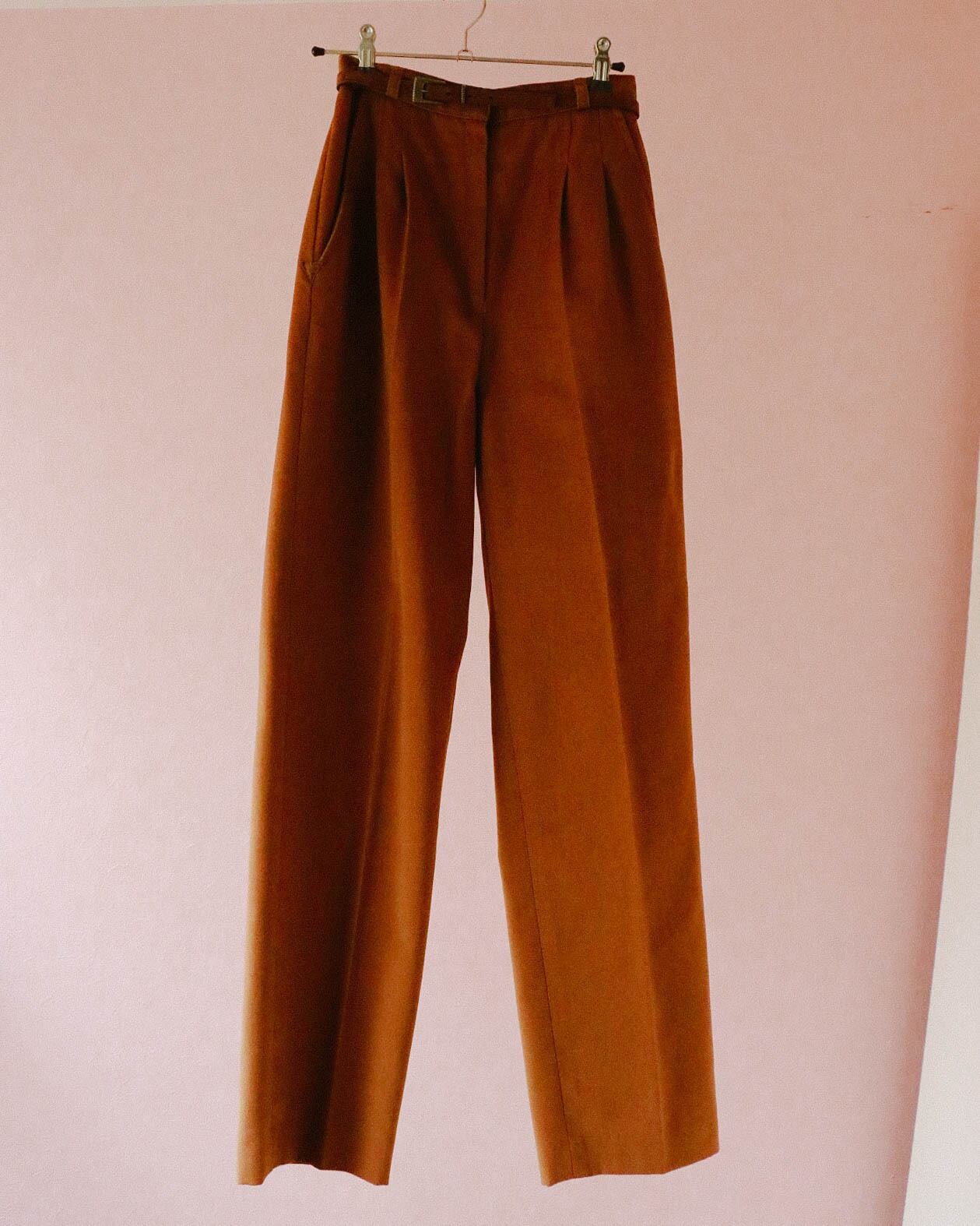 足のラインが響かない、程よい生地の厚みや幅感、センタープレスのストレートに近いテーパードシルエットがスタイル良く魅せてくれる。色柄と合わせやすく、小洒落てみえる色味も◎