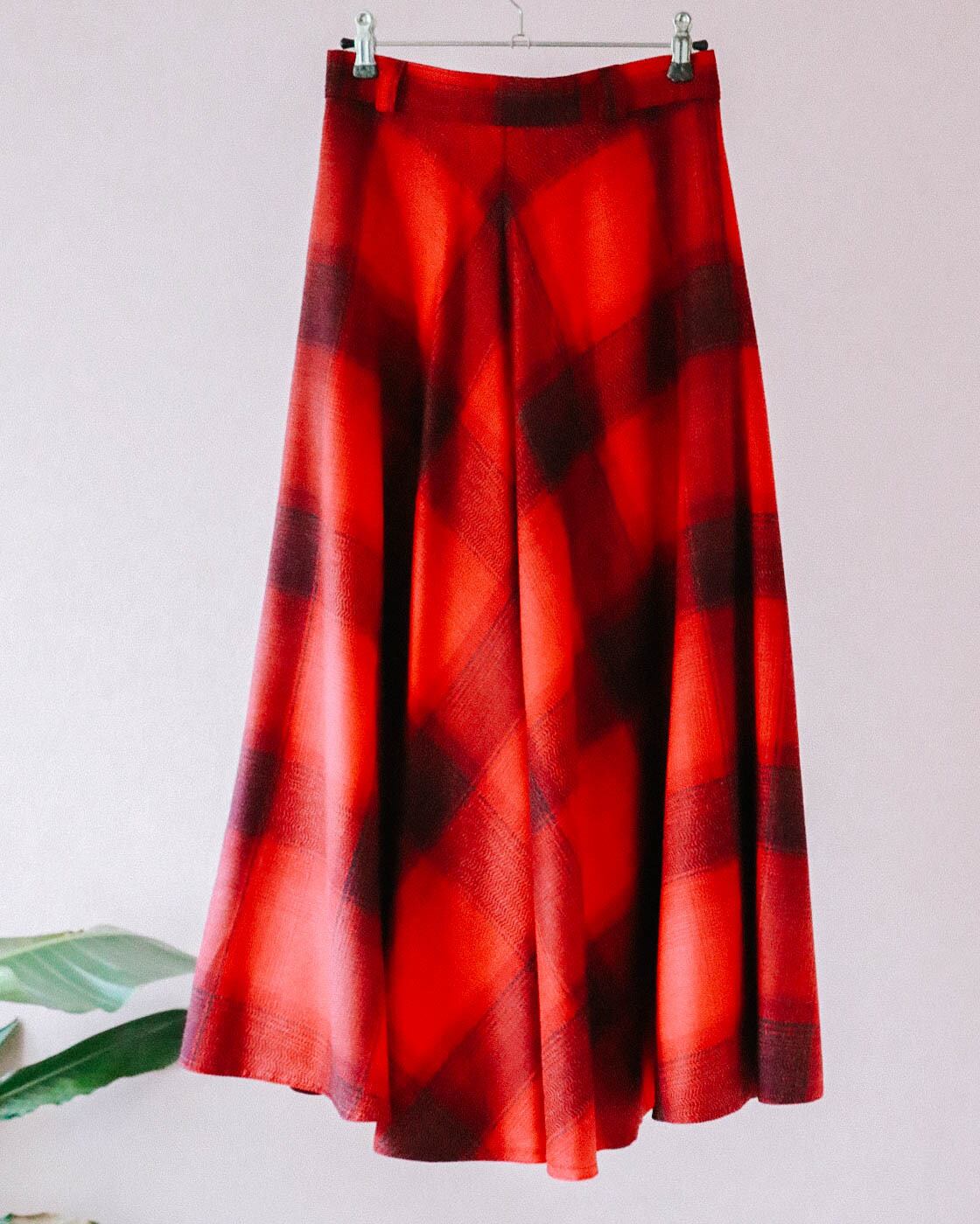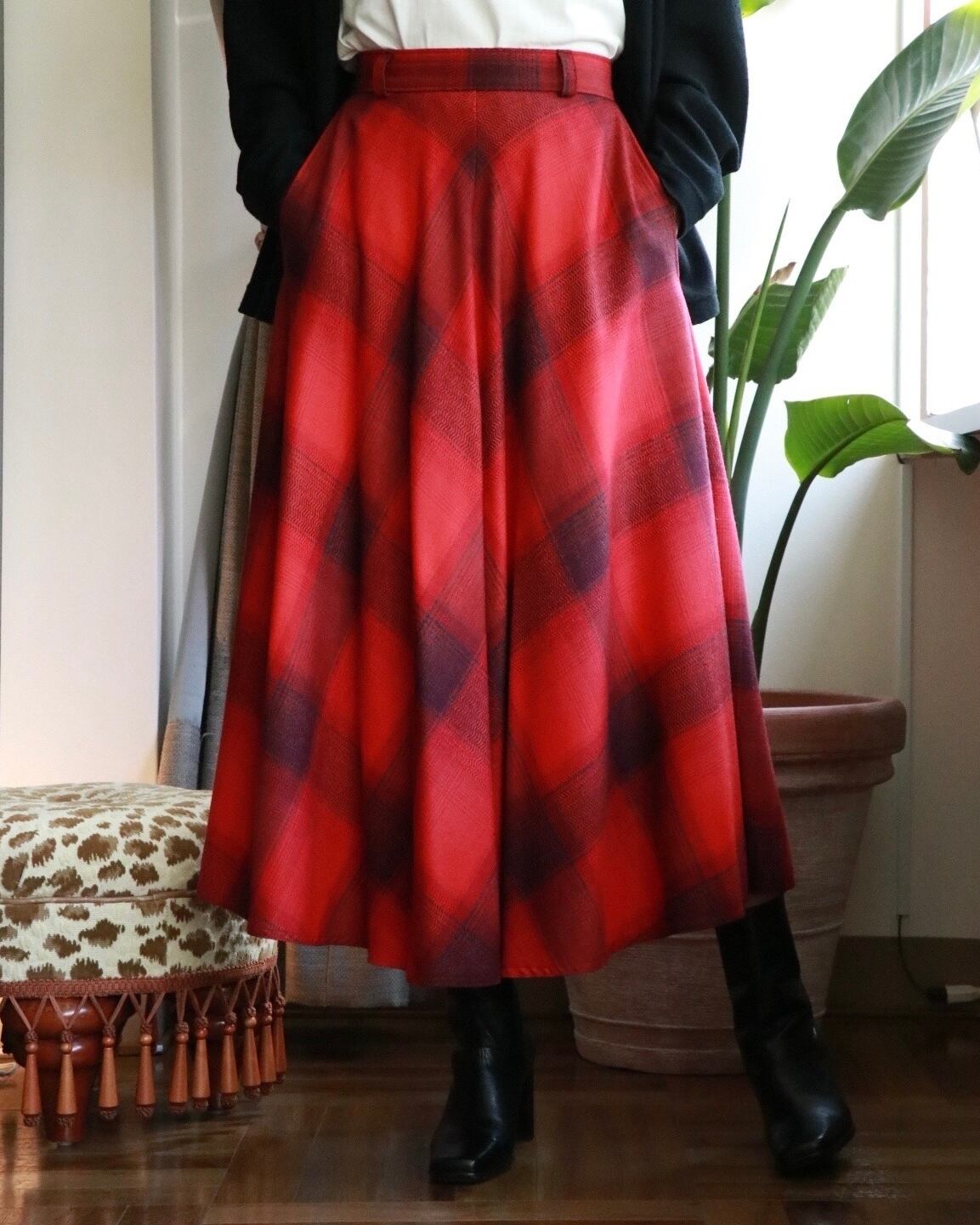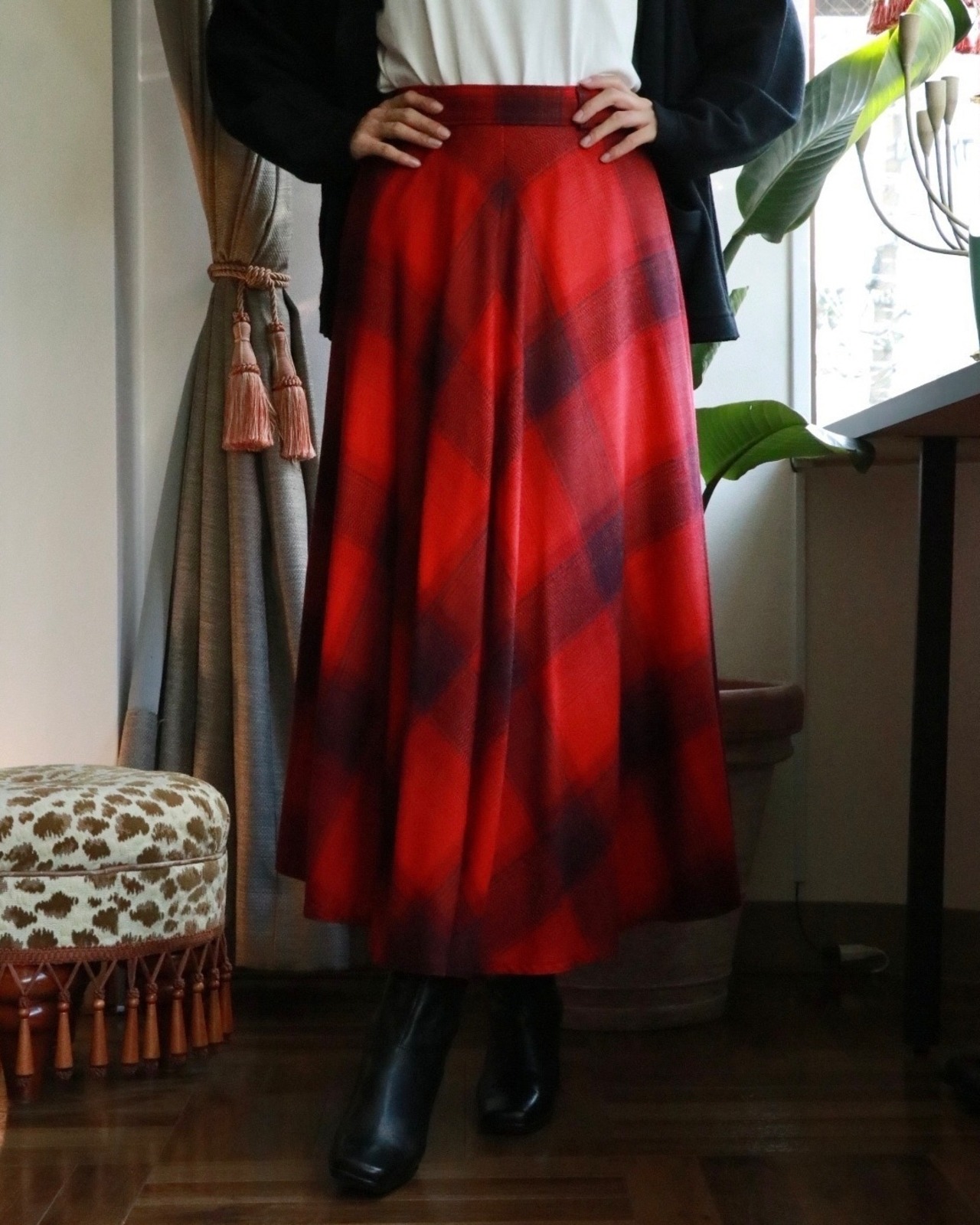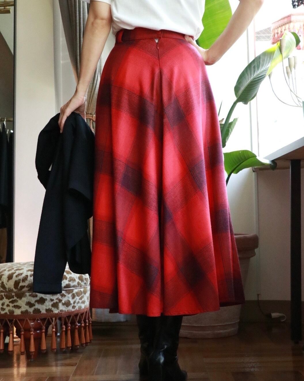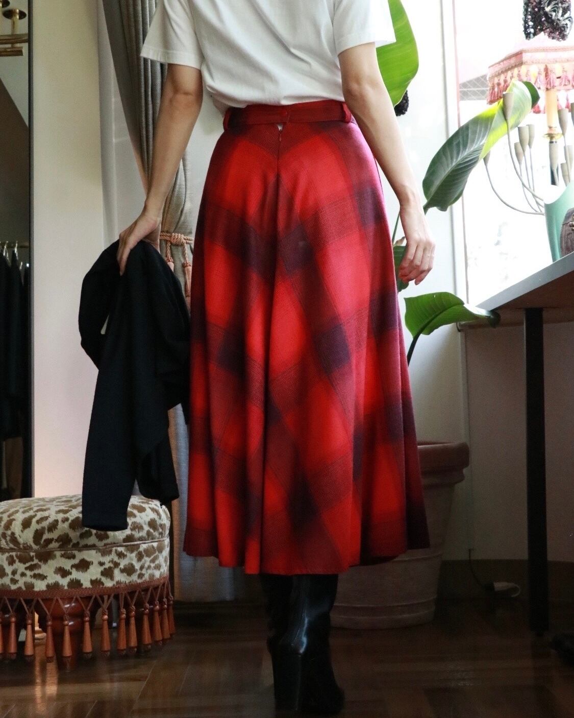 チェック柄が恋しくなるこの季節にふさわしいバッファローチェックのような鮮やかな赤と黒が織りなすスカート。ボリュームのある生地量で至高の一着です。