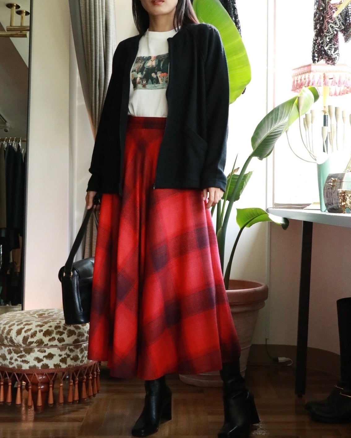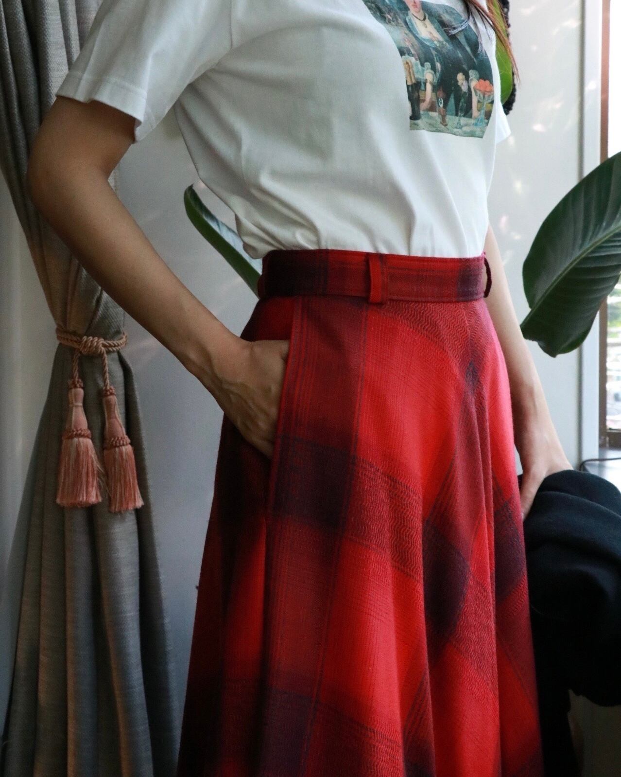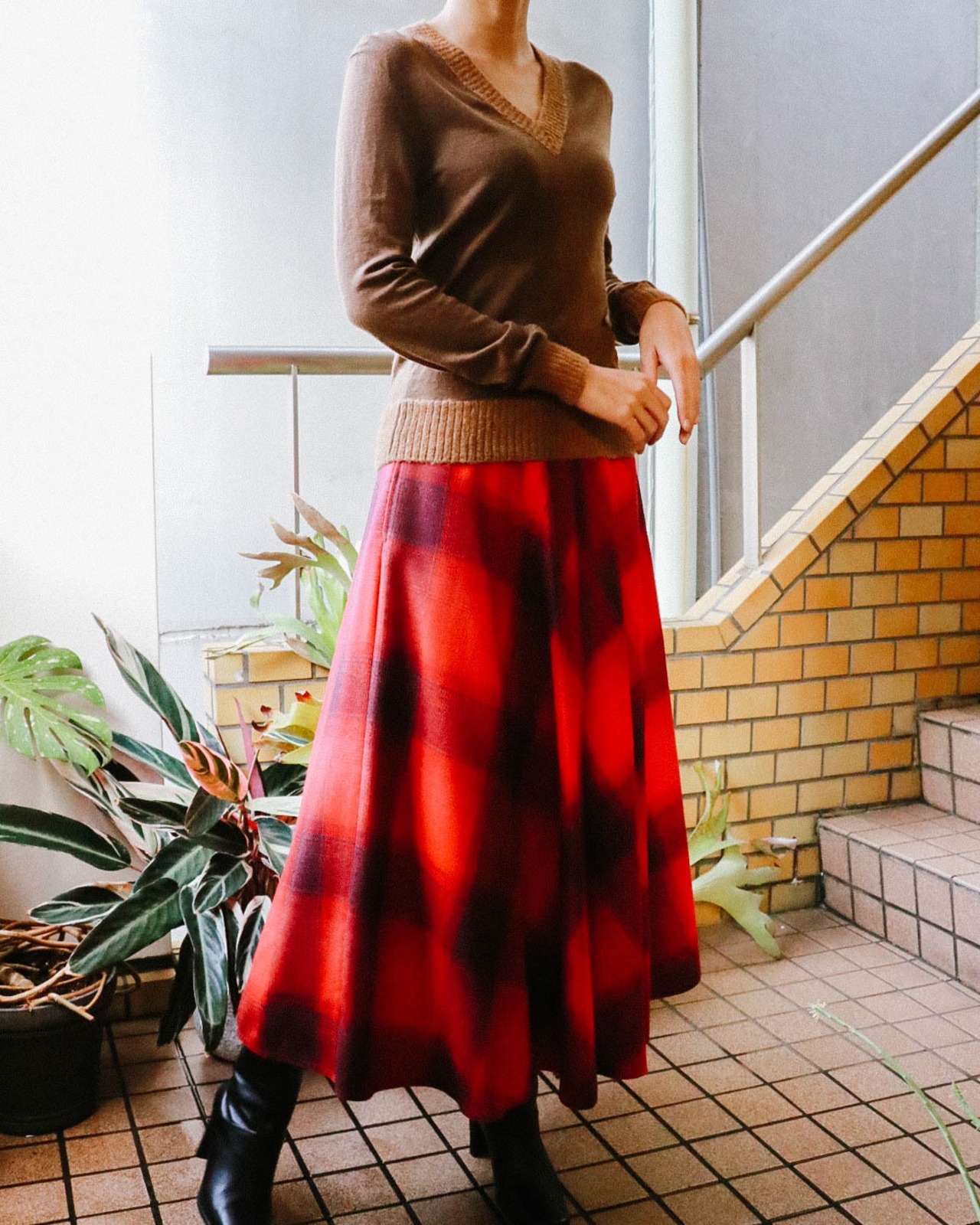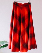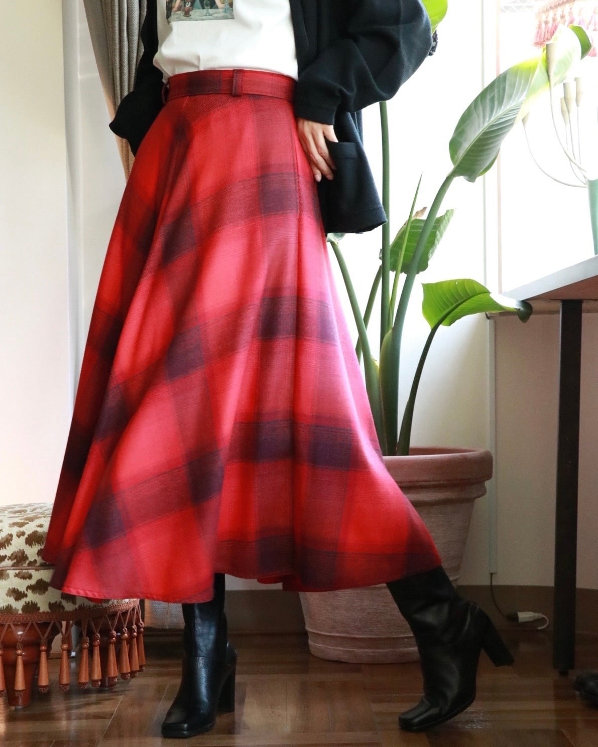チェック柄が恋しくなるこの季節にふさわしいバッファローチェックのような鮮やかな赤と黒が織りなすスカート。ボリュームのある生地量で至高の一着です。