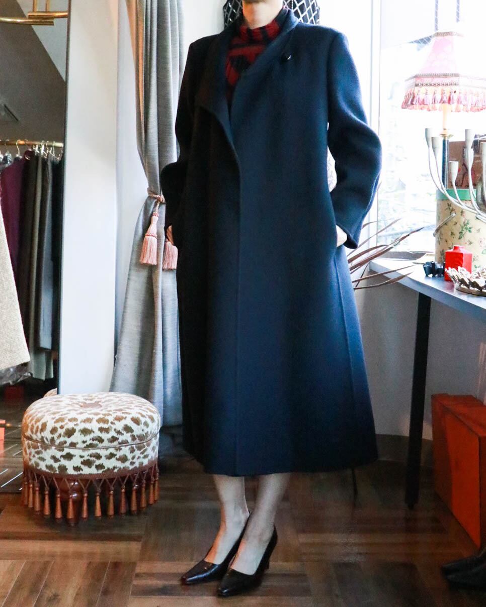 イタリア製の柔らかいカシミア混コートが入荷。黒のコートは一着は持っておきたいアイテムの一つですが、素材によっても印象が変わるので一着以上欲しいのが正直なところ。比較的羽織りやすい一着で、首元のシングルボタンで、クラシックな雰囲気を楽しめるデザインです。