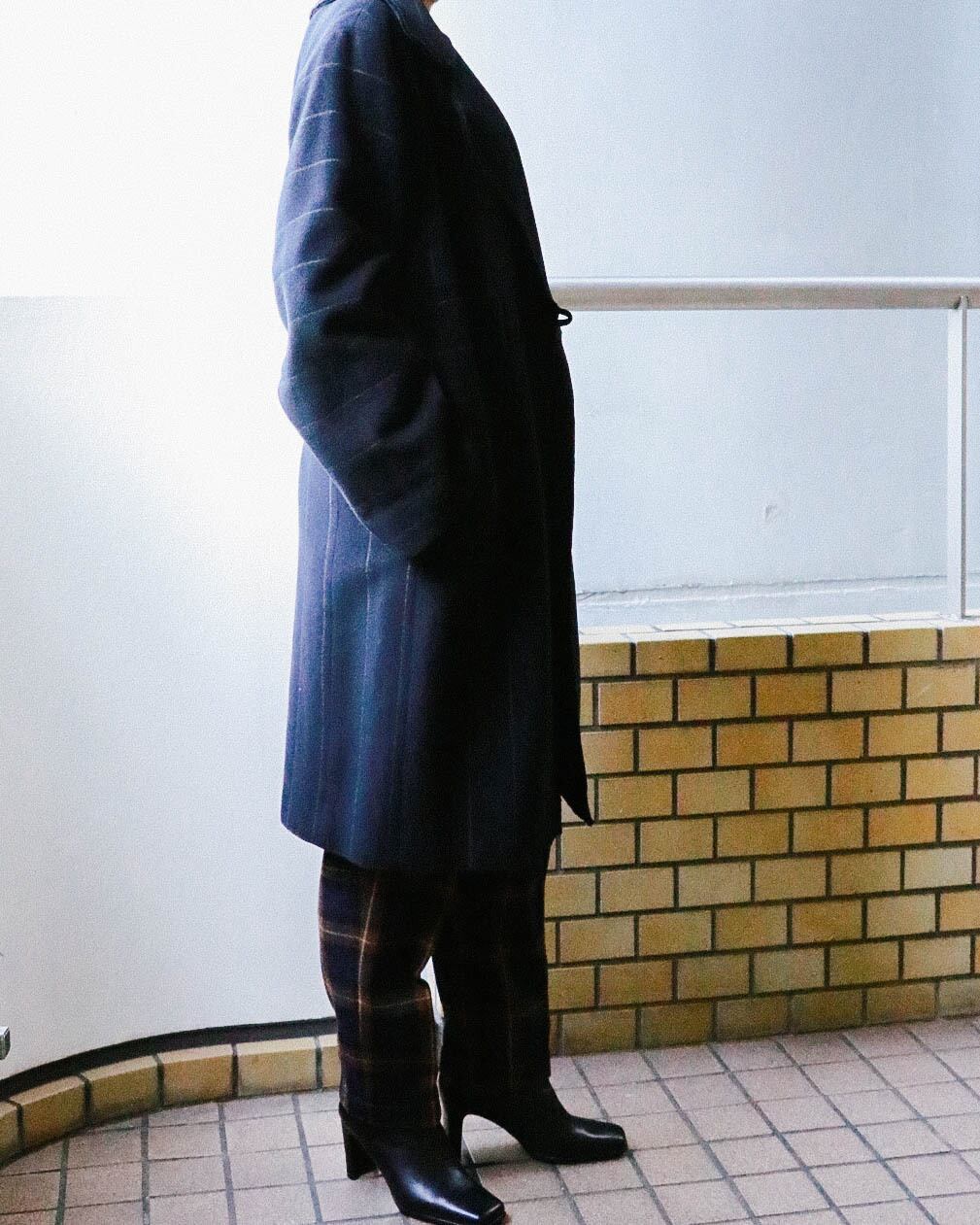 ワントーンなダークカラーに頼りがちなアウターですが、こちらは縦横に入った無秩序なラインと中心をずらしたシングルボタンが個性的。コートにしては珍しいデザインです。
