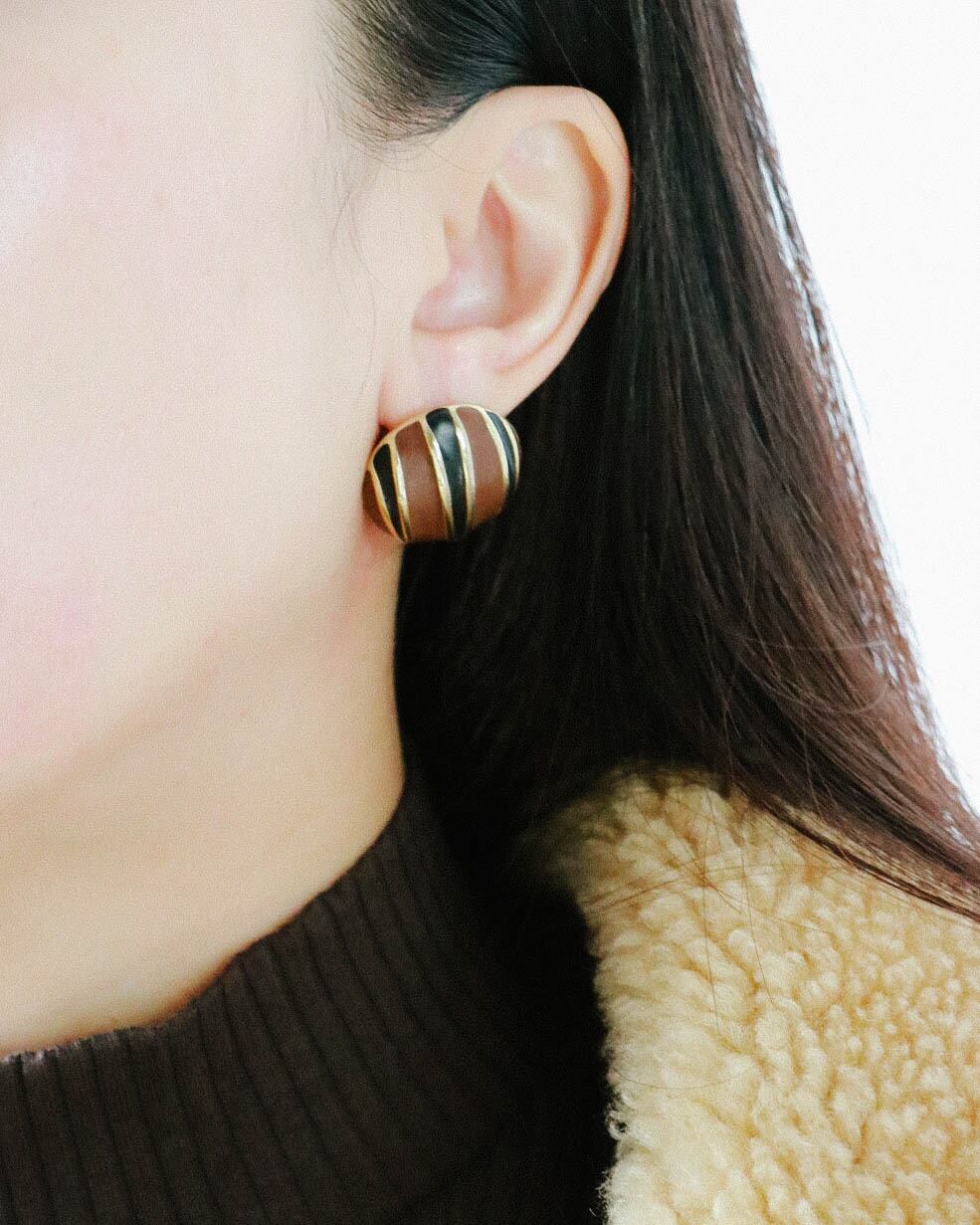 シックな3色の組み合わせが肌馴染みよく、品ある輝きを放ちす、デッドストックのピアス。顔周りの印象を引き締めたいときに使えます。