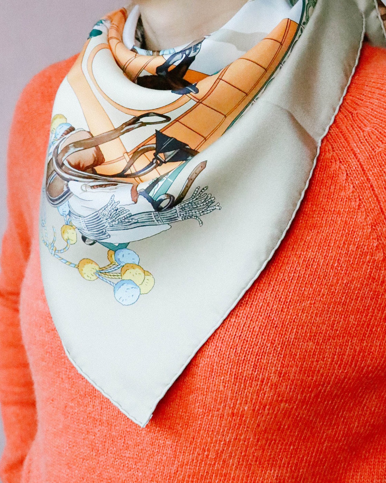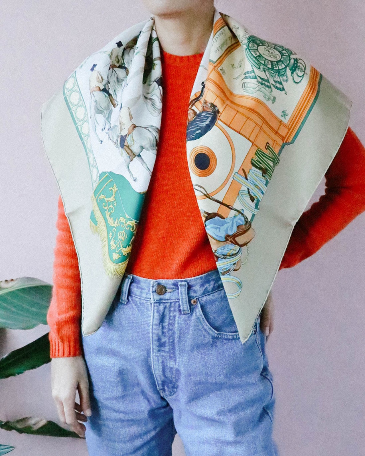 エルメスの世界観が詰まったストーリー性のある王道スカーフ。デザインの豊富さから現行、ヴィンテージ問わずつい集めたくなってしまうスカーフ 。折りかた、結び方で色々な遊びができるアレンジ能力の高いところがいい。洋服では取り入れにくい色味などもぜひこういった小物で挑戦してみてはいかがでしょうか。