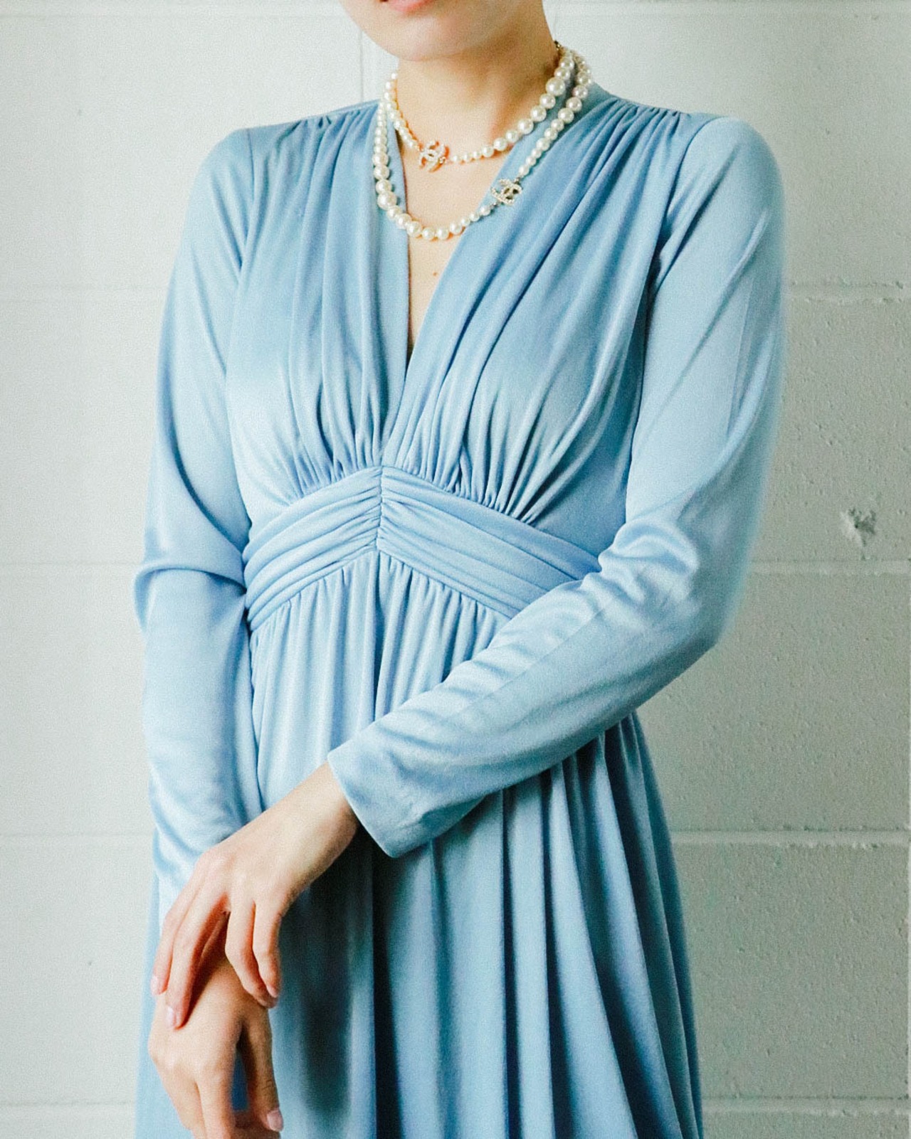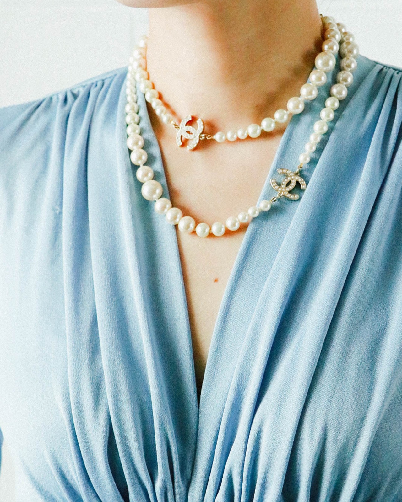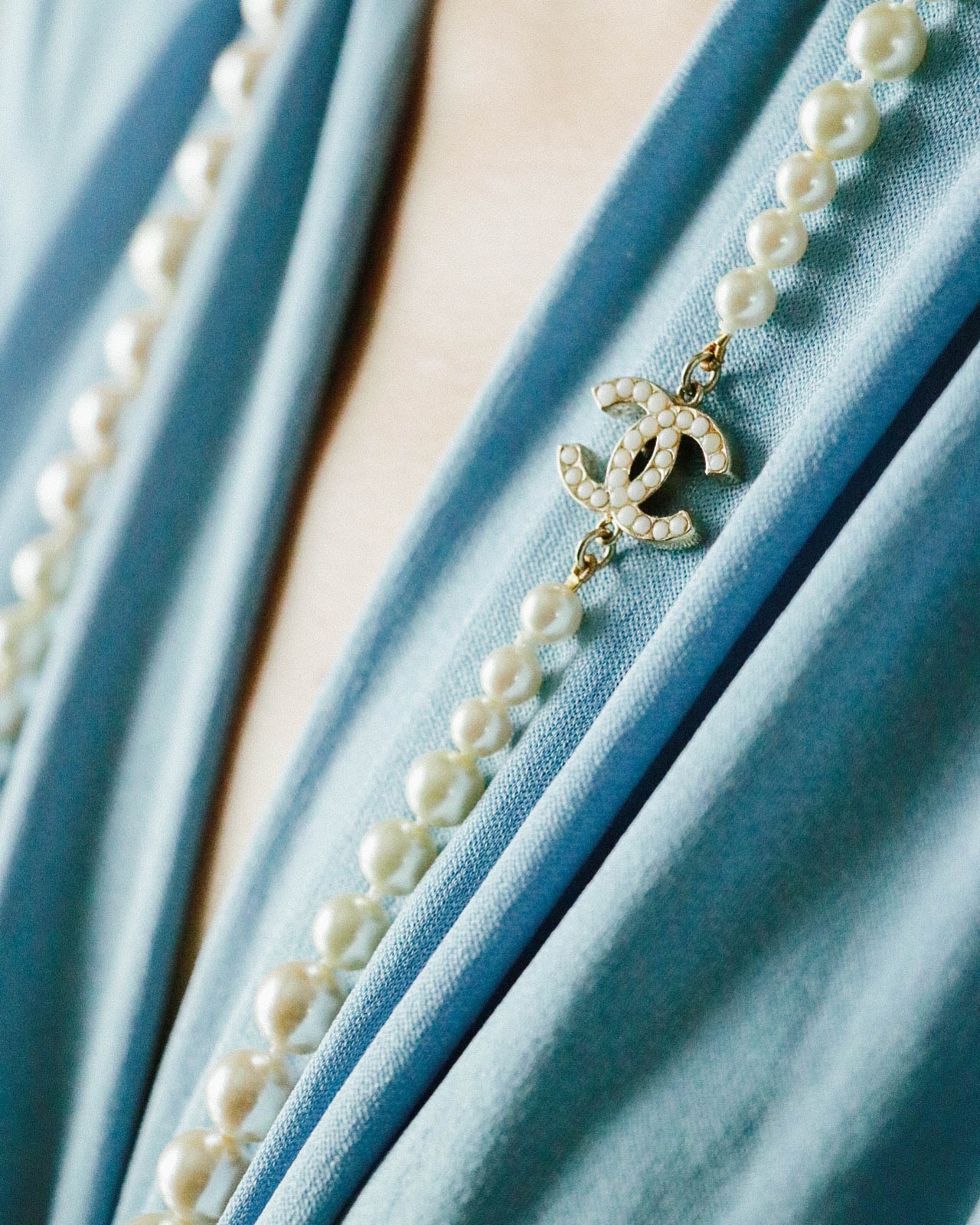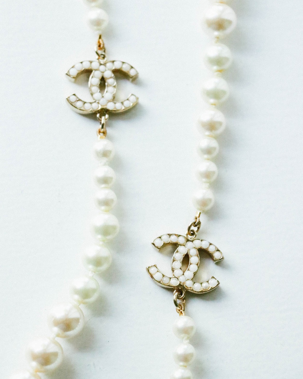控え目で気品あるイメージのパールにプラスアルファした、シンプルながらもデコラティブなロングネックレスはシャネルのもの。