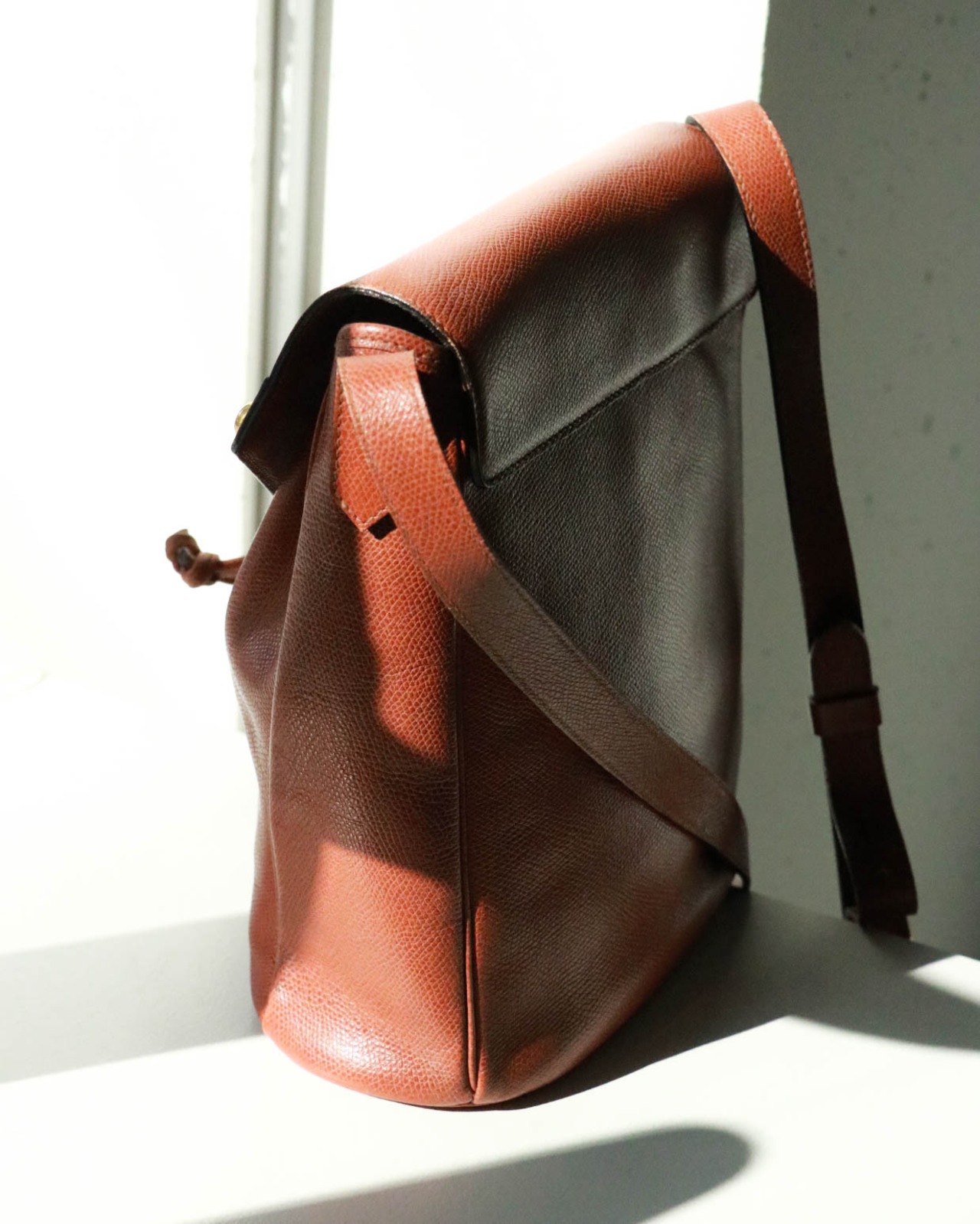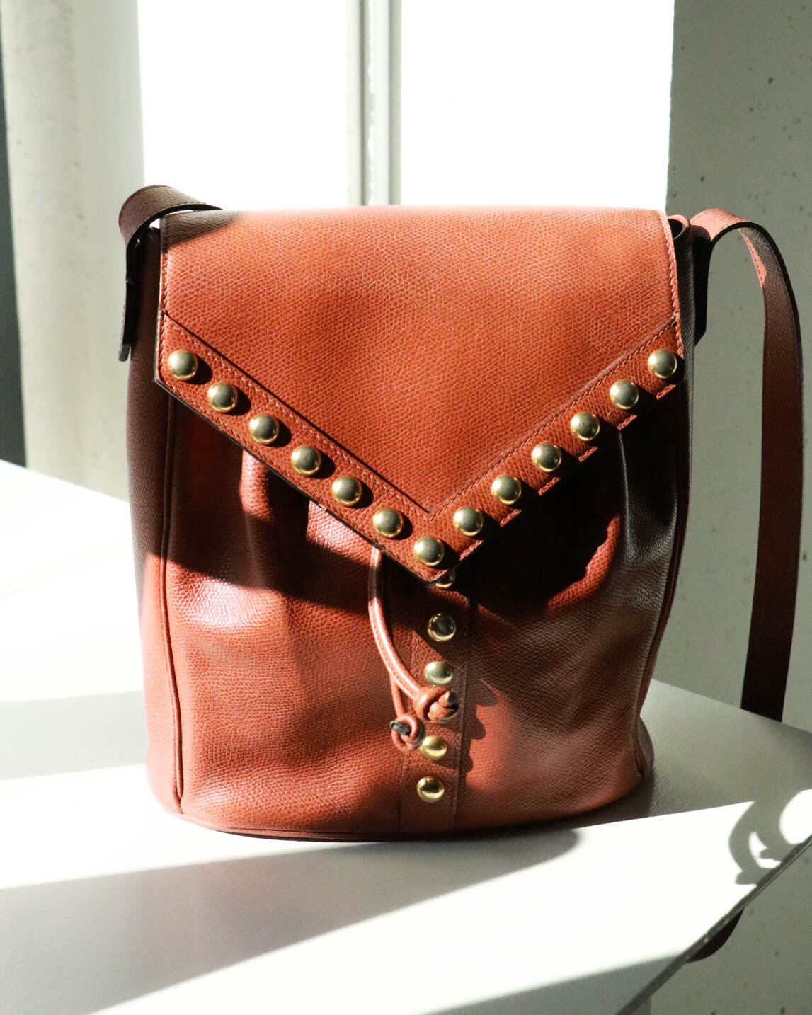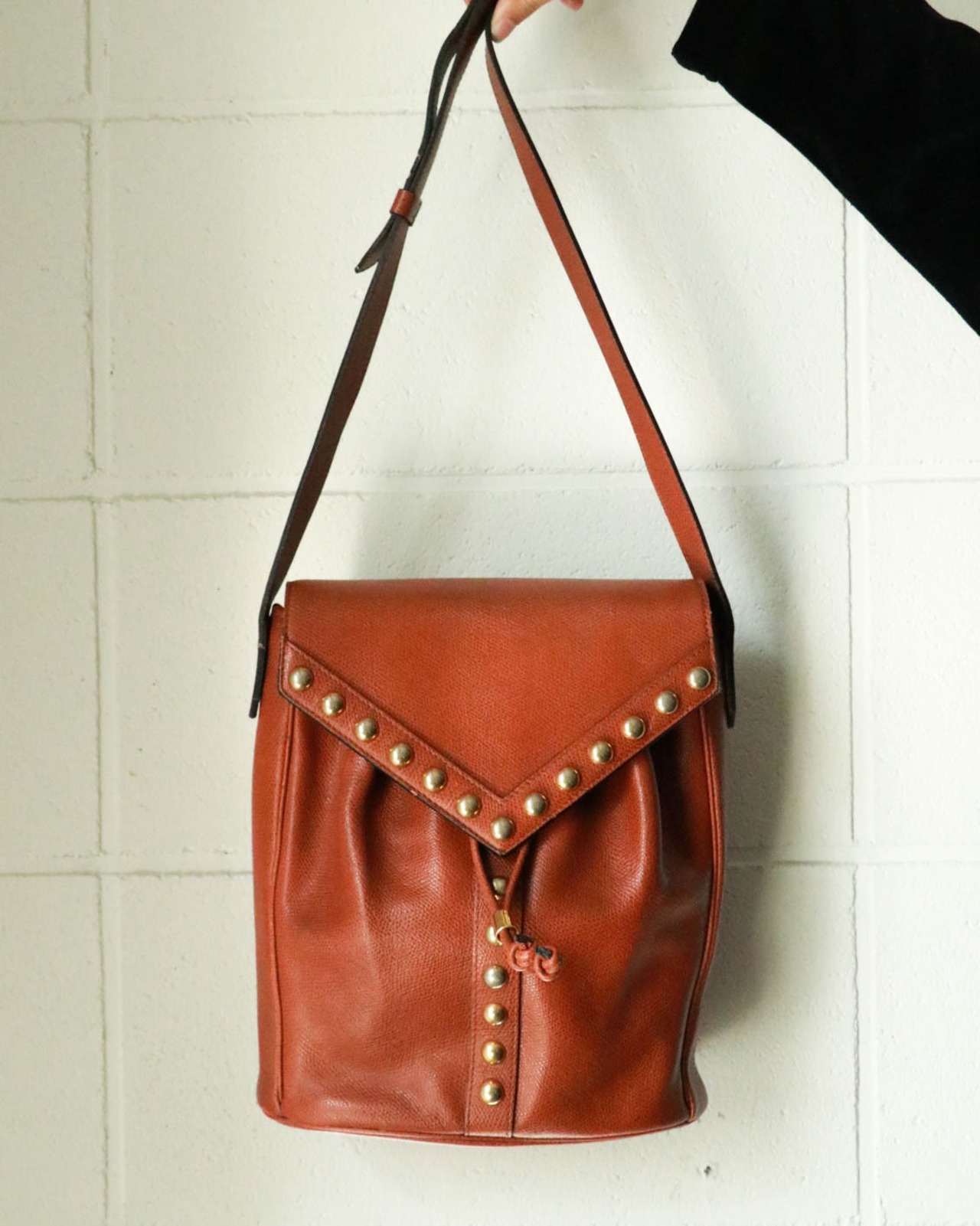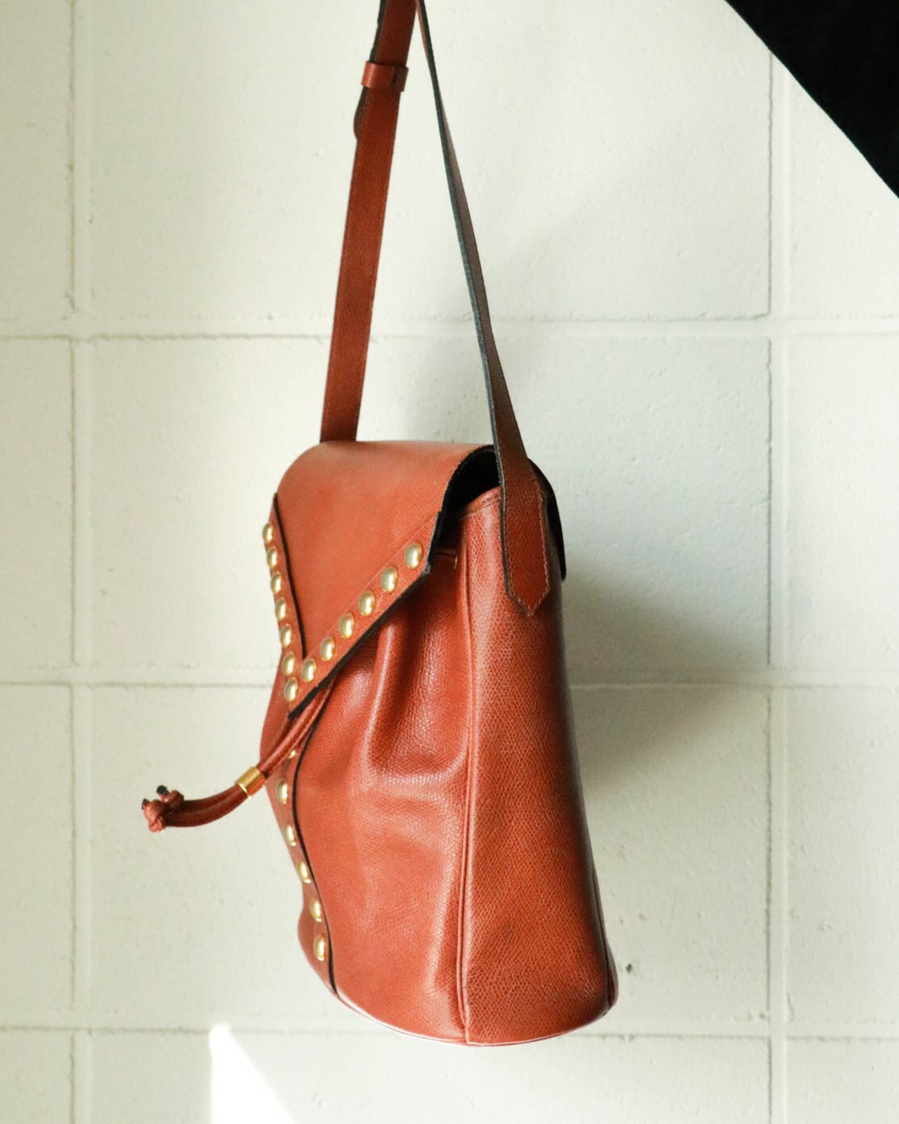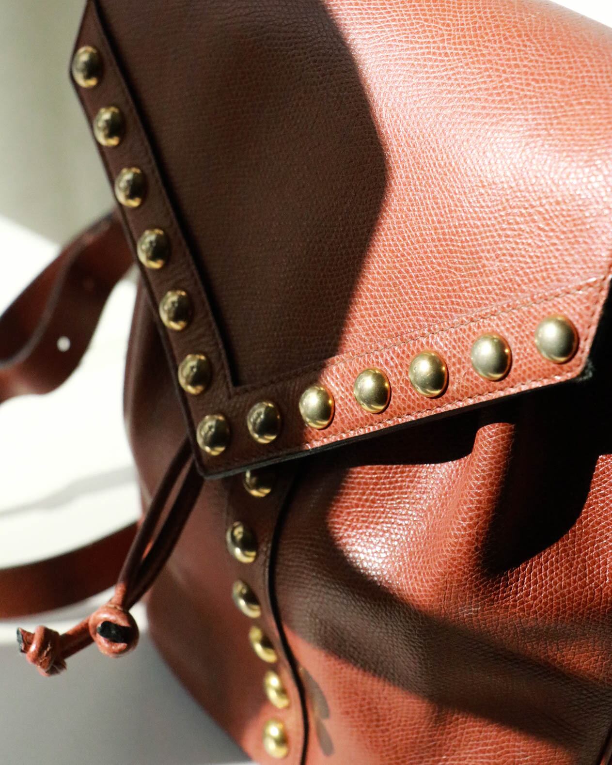 イブサンローランのブラウンレザーショルダーバッグ。フロントに付いたYマークのゴールドスタッズがエッジを利かせたデザインで、クラシックスタイルはもちろんカジュアルスタイルとも相性抜群◎収納力のある優秀な縦長のサイズに、インナースタイルは安定した巾着型デザイン。マルチパーパスで永年使いたいバッグです。