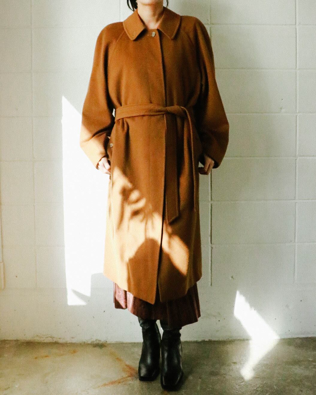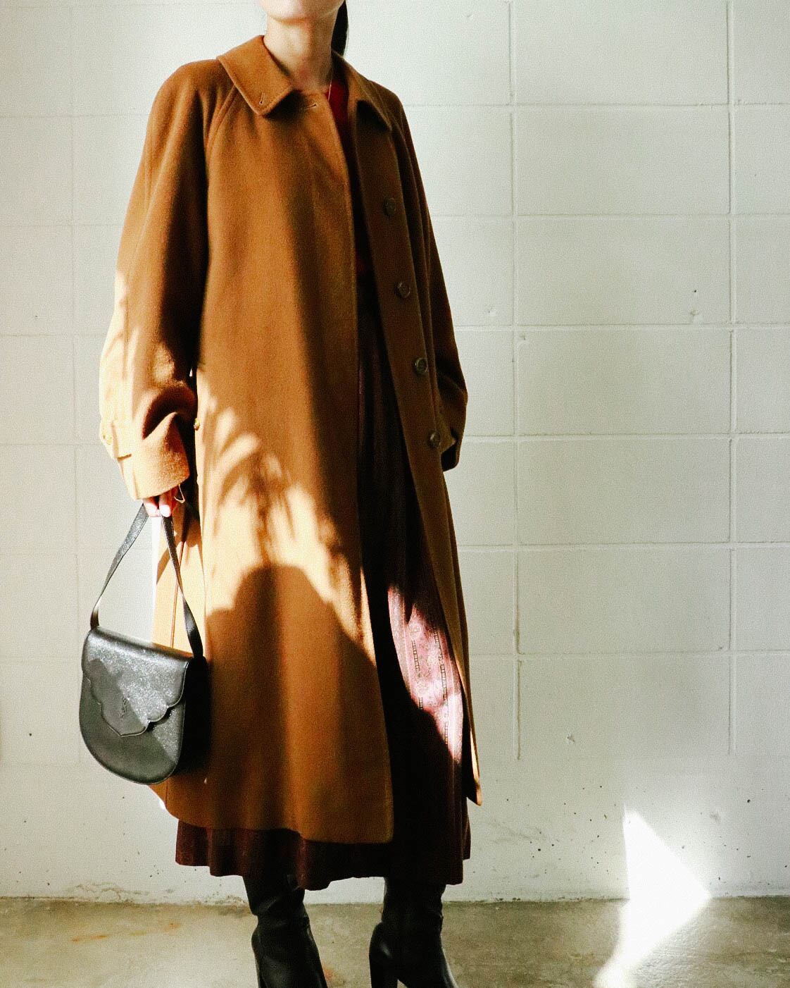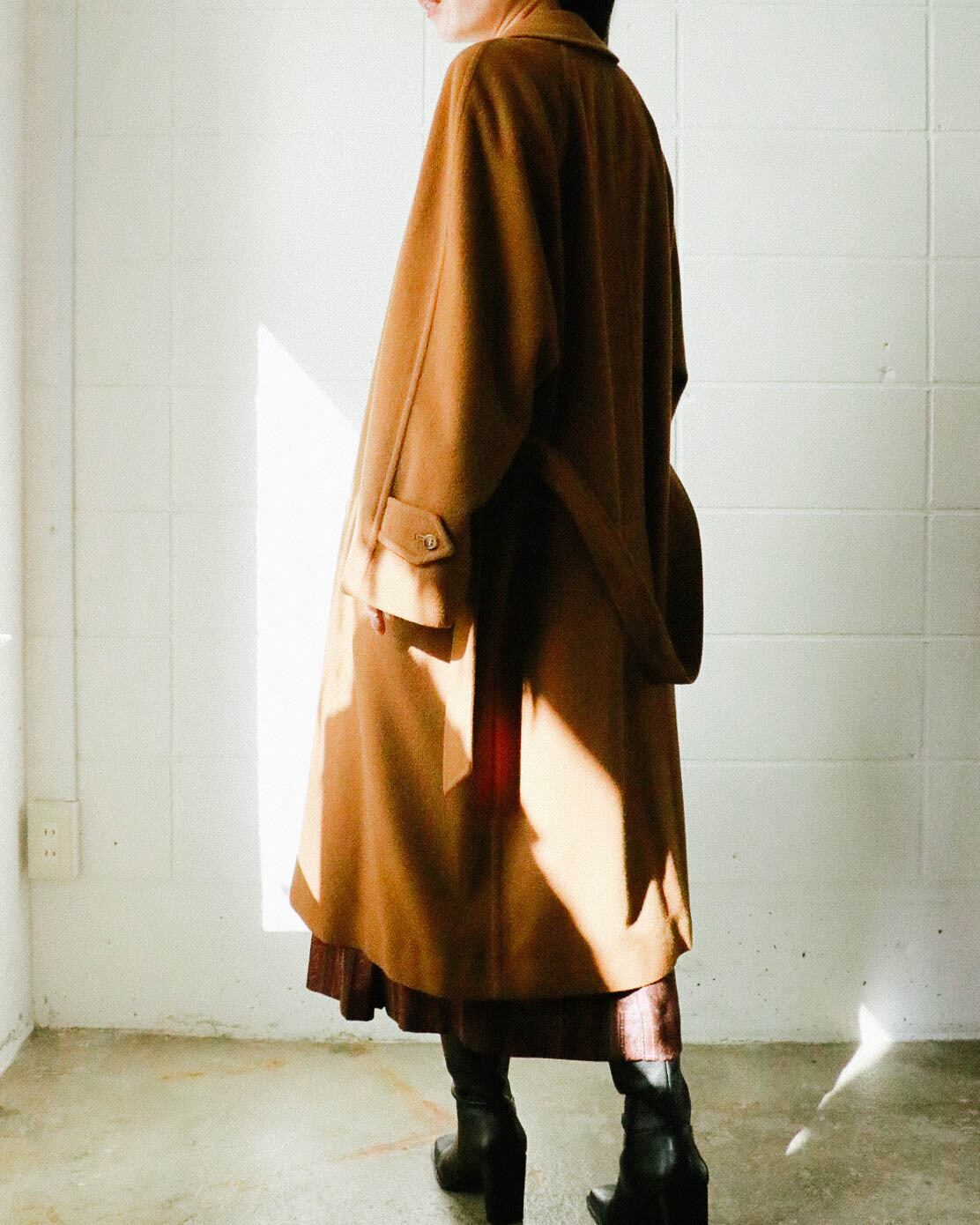 こちらはイギリス製カシミヤコート。フェミニンかつシンプルでありながらシルエット美を創り出す計算されたディテール。