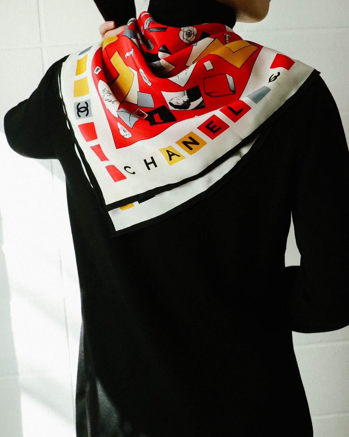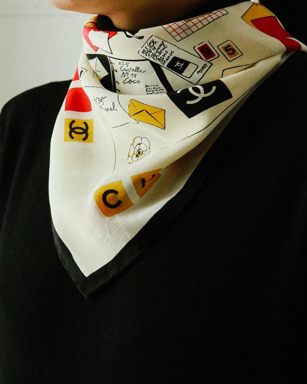 シャネルを代表する香水、カメリア、女性像などのモチーフが散りばめれたデザインがキャッチーで可愛い。しなやかなシルク素材はアレンジがしやすいのも特徴的でスッとまとまってくれる。