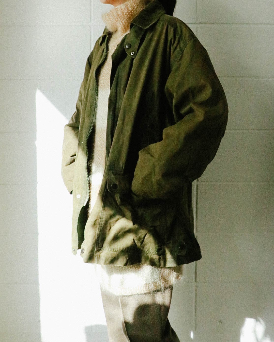 オイルドジャケットとは、一般的には生地の表面に油を塗り込み、表面に光沢や防水性や保温性をもたせた頑丈なジャケットです。こちらはSt. Michael のもので機能性、デザイン性両方を兼ね揃えたすぐれもの。着れば着るほど特有の味わいがでてくるのも楽しみのひとつ。