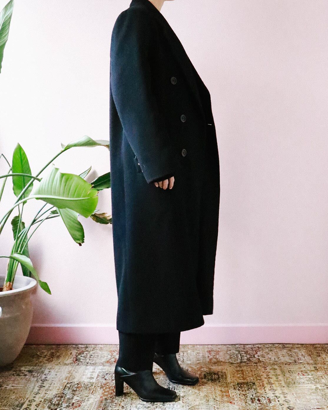 1980'sのブラックコート。キャメルヘアーの軽い素材感にダブルボタンでウエストがマークされたタイトなシルエットが嵩張る冬のコーディネートを暖かく引き締めてくれます。ブラックのコートはトレンド問わず毎年冬に大活躍できます。