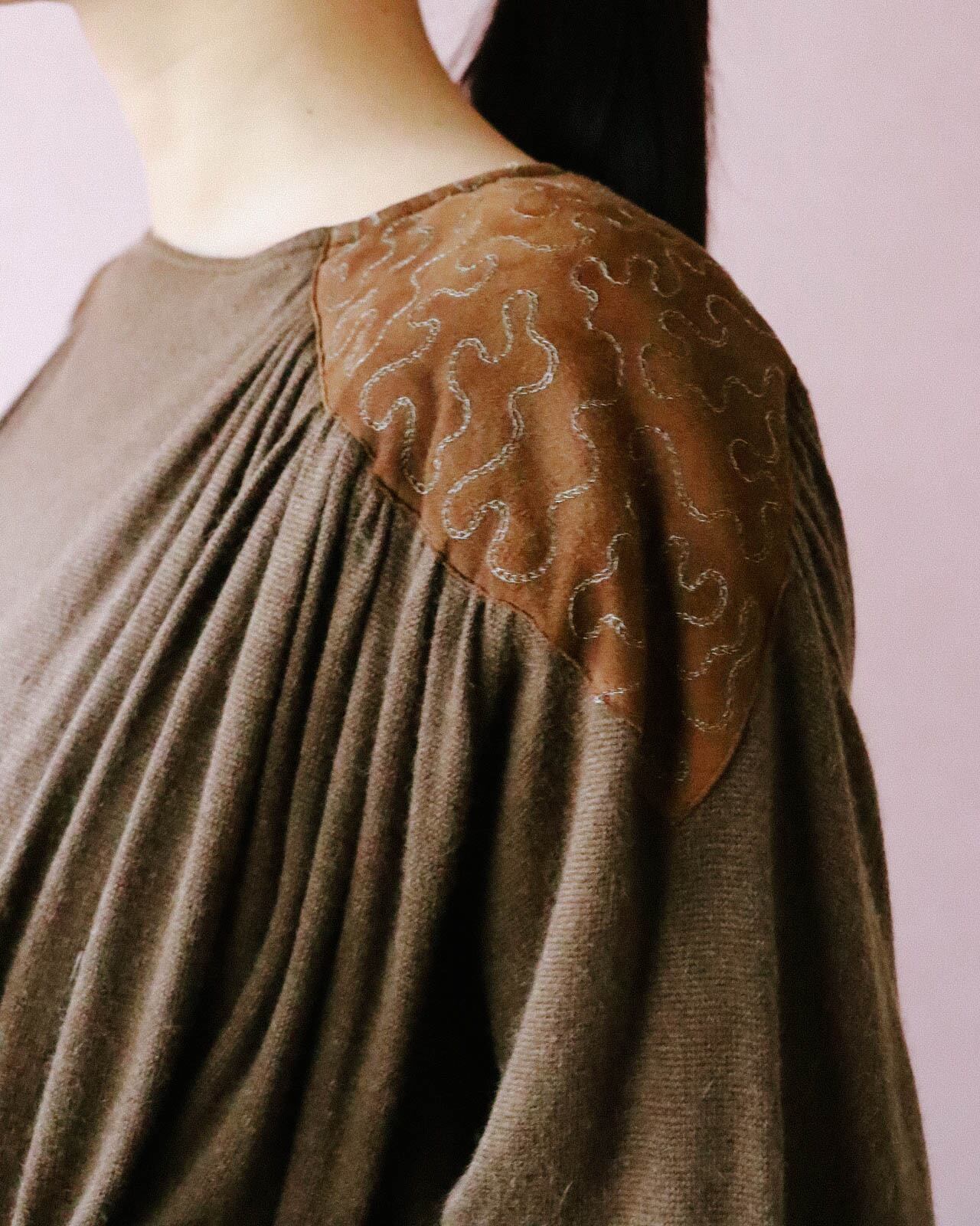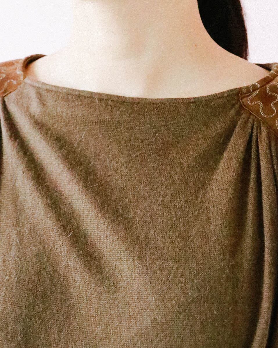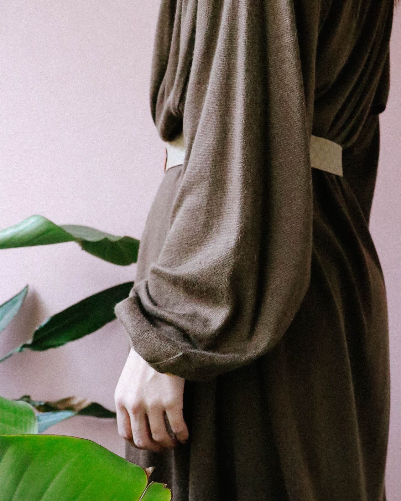 ショルダーはスエードタッチのアクセントが施されコンサバティブにはならず、手元で弛む柔らかなニットが女性らしさを高めてくれる。ウエストマークしても一枚でもシルエットが綺麗なのでその日の気分で。あるようでないブラウンカラーが気品を添える大人のデイリードレス。
