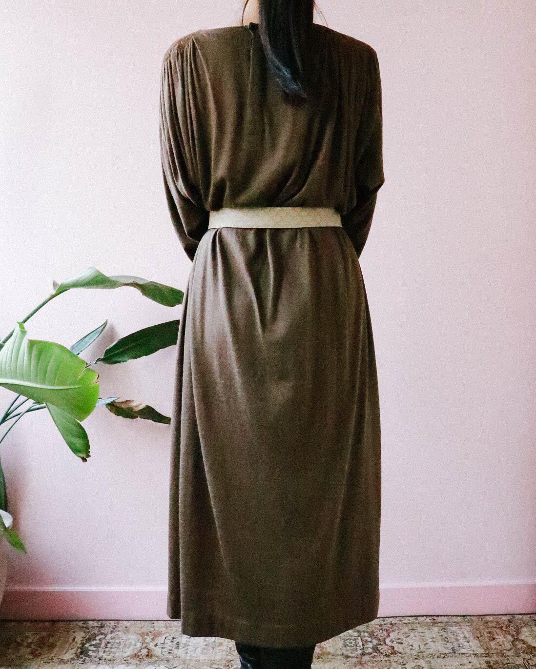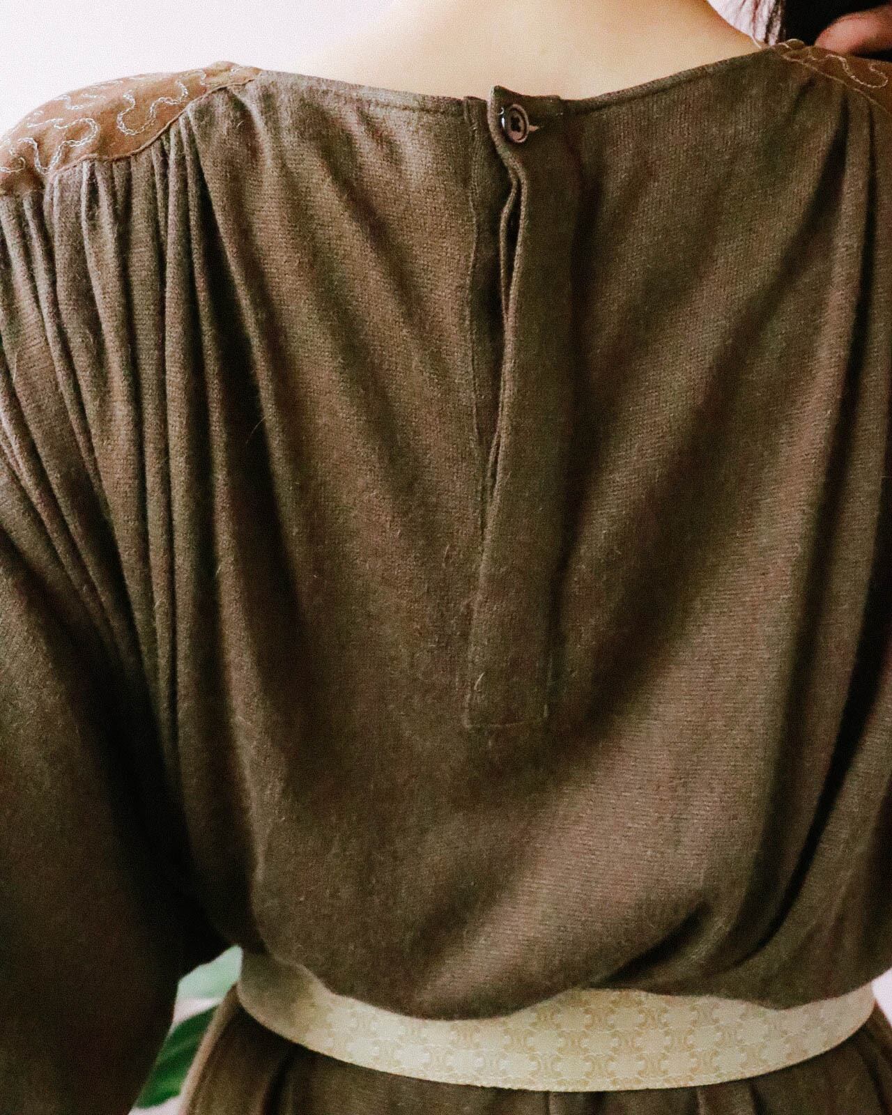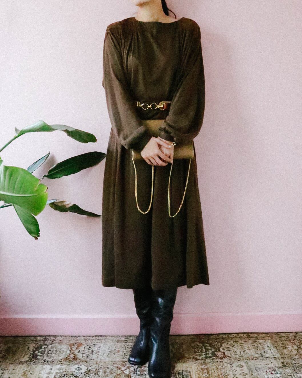 ショルダーはスエードタッチのアクセントが施されコンサバティブにはならず、手元で弛む柔らかなニットが女性らしさを高めてくれる。ウエストマークしても一枚でもシルエットが綺麗なのでその日の気分で。あるようでないブラウンカラーが気品を添える大人のデイリードレス。
