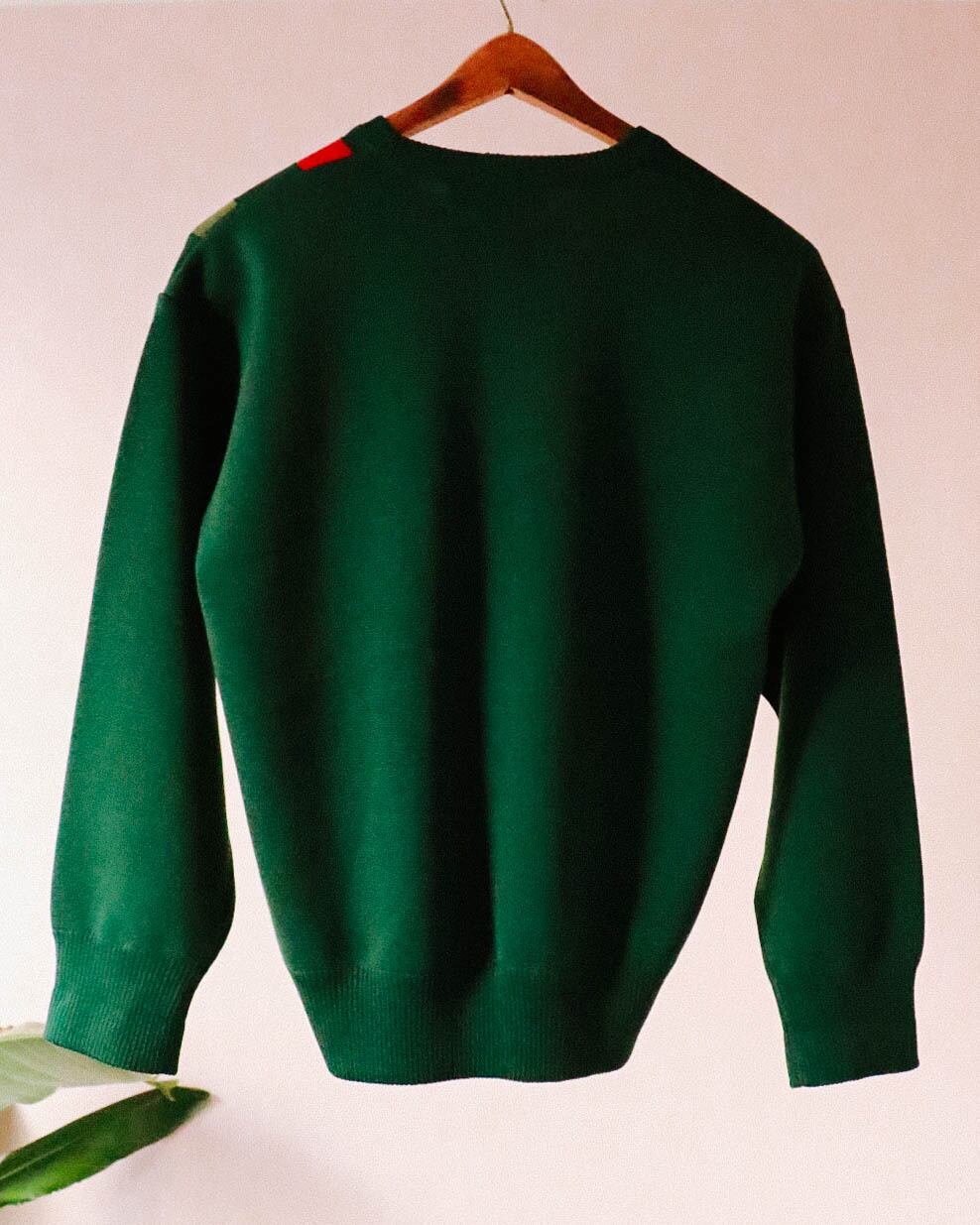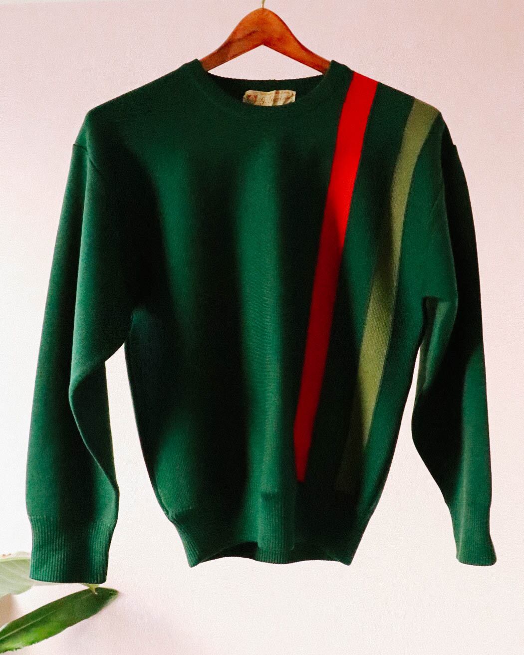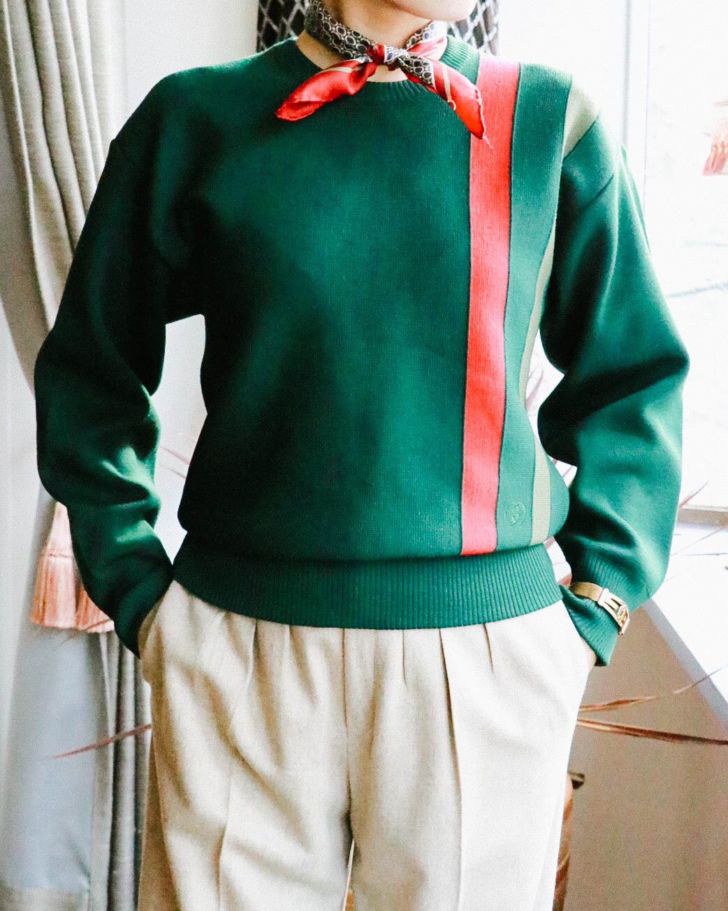 ダークグリーンのニットはオールドGUCCI。程よいボリュームのあるゆったりシルエットに加え、左側に入った赤とライトグリーンのライン、さりげなくグッチのロゴ刺繍が上品ながアクセントに。カジュアルでありながら気品ある一着は大人のカジュアルスタイルにマッチするニット。