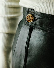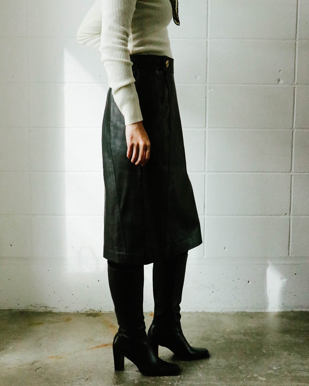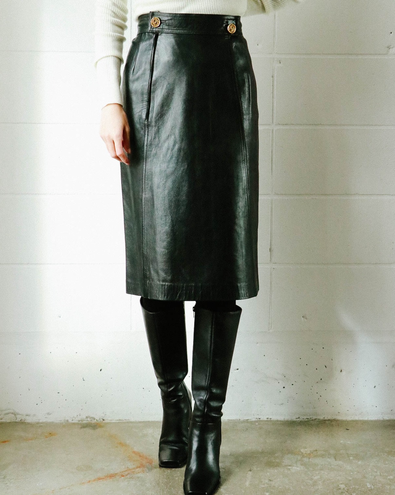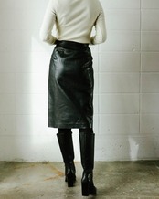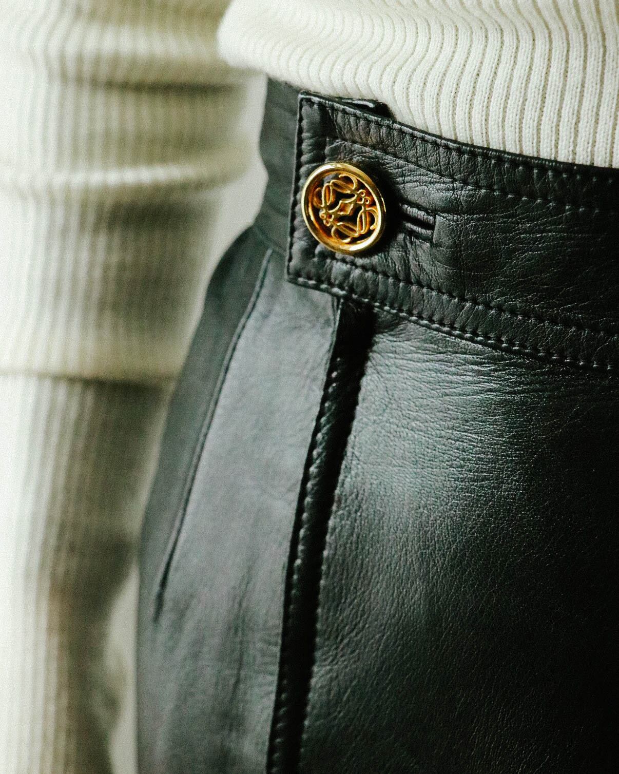 触ればわかる滑らかかつ柔かな上質レザーを使用したスカートはロエベのもの。素材の良さだけでなくシルエット美も完璧。ウエストについたLOEWEのゴールドロゴボタンがブラックレザーに上品なアクセントを与えます。裏地もしっかりとついたベーシックデザインのレザースカートはトレンド問わず、すっと愛用します。